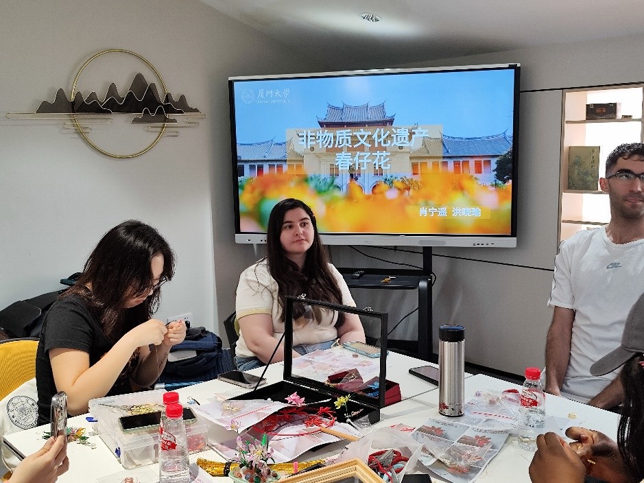 From the moment the two teachers walked in, students were surrounded by the beauty of spring flowers, getting a chance to craft hairpins and ornaments themselves. Tailoring her approach to the learning styles of international students, Xiao provided a comprehensive overview of the origin, heritage, applications, crafting techniques, and unique aspects of Chunzaihua with vivid descriptions. She used Hongcuo Village in Xiang’an district as an example to showcase the dynamic folk craft of floral making and illustrate its significance in the daily lives of the Minnan people.