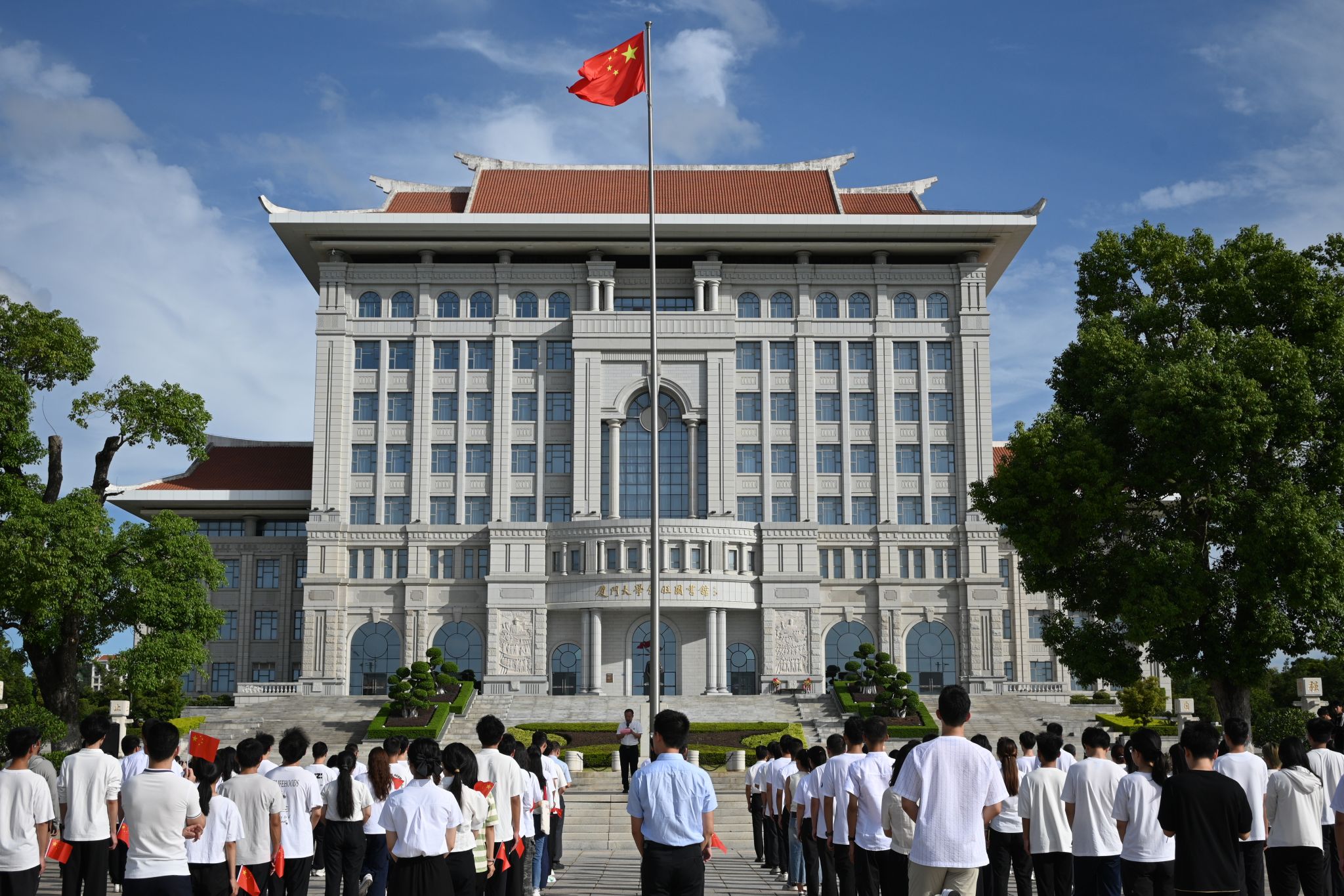On the morning of October 1, XMU Xiang’an Campus held a flag-raising ceremony in the South Square of Dewang Library in celebration of the 75th anniversary of the founding of the People's Republic of China.