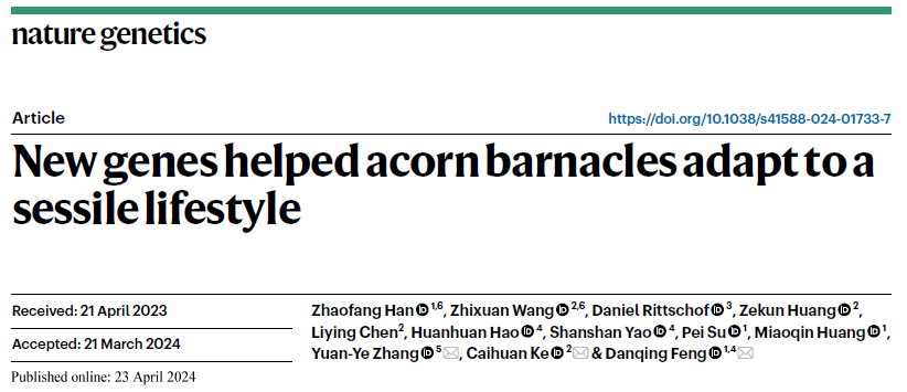 Recently, the team of professors Caihuan Ke and Danqing Feng from College of Ocean and Earth Sciences, Xiamen University, collaborated with associate professor Yuan-Ye Zhang from College of the Environment and Ecology, Xiamen University, published their research in Nature Genetics, revealing the mechanisms of new genes involved in the adaptation to the benthic sessile lifestyle of acorn barnacles.