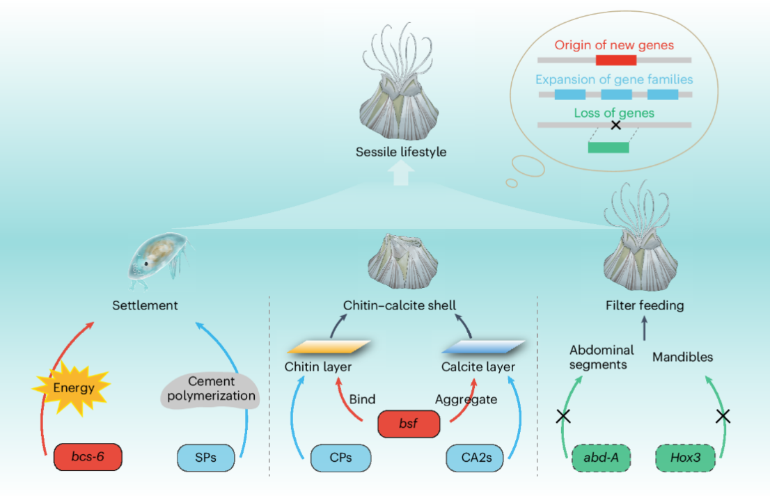 Their study constructs a chromosome-level genome assembly of the acorn barnacle Amphibalanus amphitrite. Using this genome together with multi-omics datasets and functional evidence, they reveal the evolution and function of two lineage-specific genes, bcs-6 and bsf, that help the acorn barnacle adapt to a sessile lifestyle.