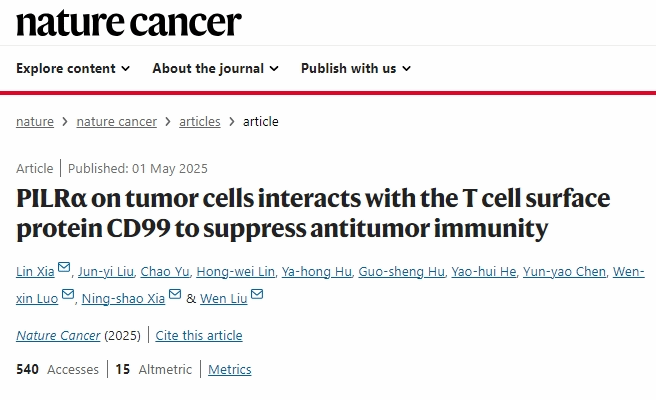 Immune checkpoint blockade using anti-programmed cell death protein 1/programmed cell death 1 ligand 1 antibody effectively targets the tumor-T cell interaction in cancer treatment, yet the overall response rate of less than 30% necessitates the identification of additional immune checkpoints modulating T cell function. Here, we identified the tumor cell-expressed paired immunoglobulin-like type 2 receptor alpha (PILRα) as an immune suppressor targeting T cells using high-throughput screening. PILRα inhibits T cell activation, proliferation and effector function by targeting CD99, a T cell surface antigen, suppressing ZAP70/NFAT/IL-2/JAK/STAT signaling. A cluster of O-glycosylated serine and threonine residues within the stalk region is critical for PILRα–CD99 interactions. Blocking these interactions with a stalk-targeting anti-PILRα antibody enhances T cell antitumor immunity and suppresses tumor growth. When combined with programmed cell death protein 1 antibody, anti-PILRα antibody shows synergistic tumor suppression. Notably, PILRα is highly expressed in several human cancers and predicts poor prognosis. These findings unveil PILRα as an immune checkpoint with therapeutic potential for clinical cancer immunotherapy.