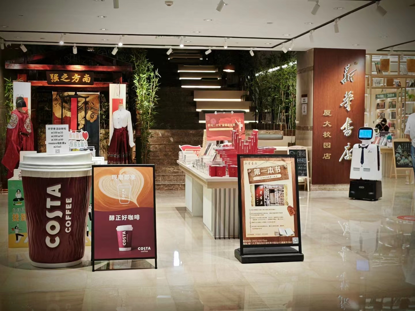 Located on the second floor of the North Hall of Dewang Library, Xiang’an Campus of Xiamen University, the bookstore covers an area of 409 square meters. It contains original foreign language books, exquisite cultural and creative products of Xiamen University, brand coffee, delicious light food, office stationery, fashionable toys, e-books, 5G new reading, robot shopping guide and other elements. It is equipped with a special area for traditional Chinese culture experience, such as traditional Chinese Hanfu, tea art and Fu culture, which is committed to letting teachers and students at home and abroad feel traditional Chinese culture; The bookstore also has learning, reading and activity space to meet the needs of teachers and students for activity space.