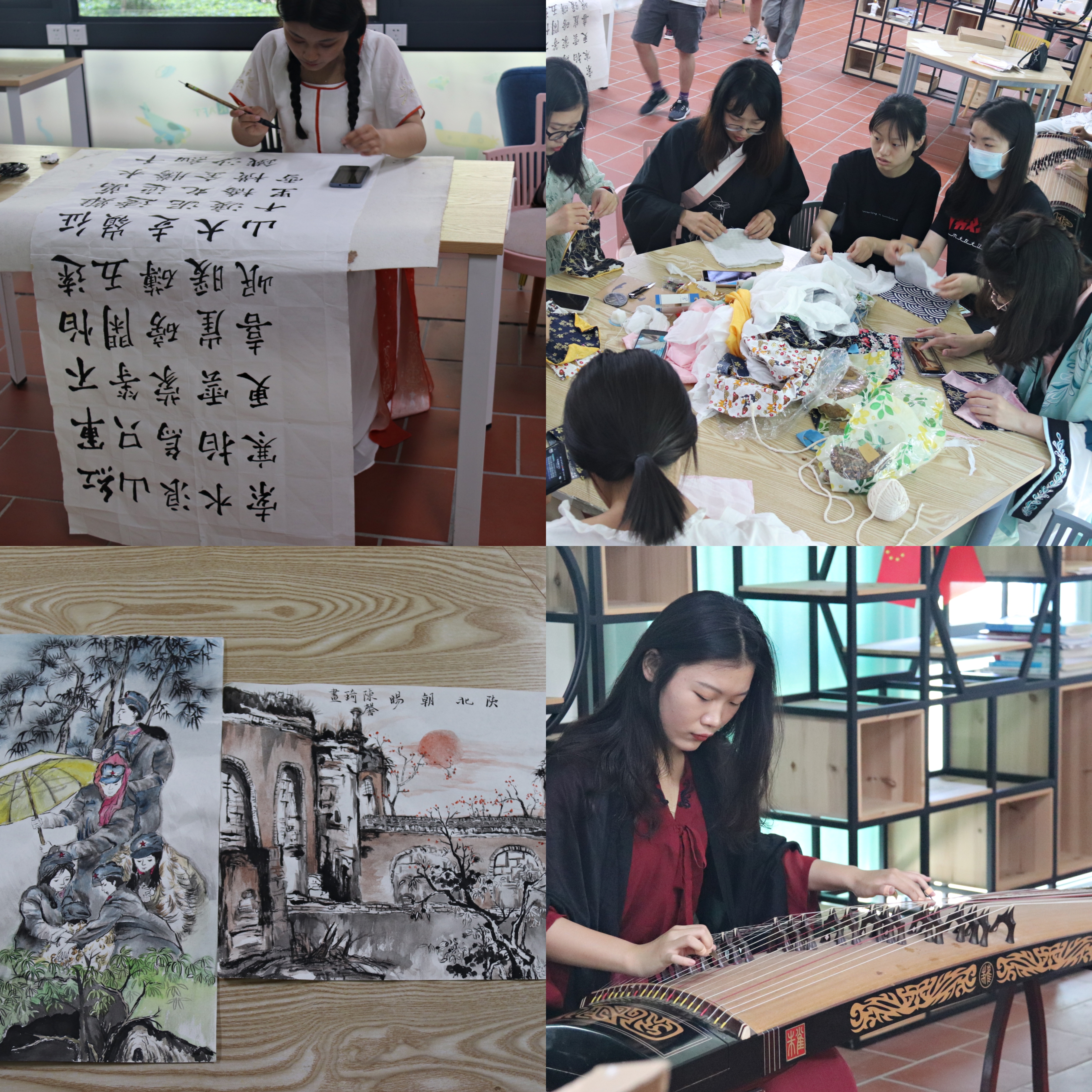 举办“我的春节”系列活动,带领留校学生写春联、剪窗花、制花灯、赏诗词、做海报、录视频,带着满满的新春祝愿,同学们除尘布新、红幅铺展、毛毫浸墨、行云流水。设计荷包制作和投壶环节,为亲友制作精巧荷包,蕴含着浓浓的关心和祝福。同学们增进了彼此的友情,在手工制作中感受中国古代劳动人民的心灵手巧以及中华优秀传统文化的别样韵味。举办“在中华传统文化美育中铭记党史”活动,同学们用毛笔书写毛泽东诗词、用国画再现长征时期的艰苦岁月、用答题方式感受习近平总书记“平语近人” 在中华优秀传统文化中学习党史、在淡墨诗香中体悟文人风情、在古筝琴弦中感受中华乐器、在荷包投壶中获得游戏快乐、在飘飘裙裾间回顾中华文化,体悟生活之美。