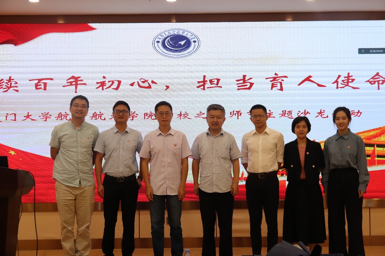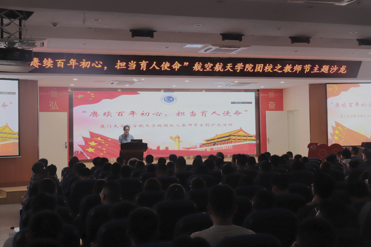 在我国第37个教师节到来之际,为贯彻落实习近平总书记对教师“学为人师、行为世范,当好学生成长的引路人”的指示精神,厦门大学航空航天学院结合新生入学教育特别举办2021年团校之“赓续百年初心,担当育人使命”教师节主题沙龙。院党委书记王康平,院党委副书记张晴、林蔚,飞行器系李沁教授、自动化系刘暾东教授、动力工程系冮铁强副教授、机电工程系王磊副教授、仪器与电气系柳娟副教授,以及学院全体辅导员、2021级全体本科新生参加活动。