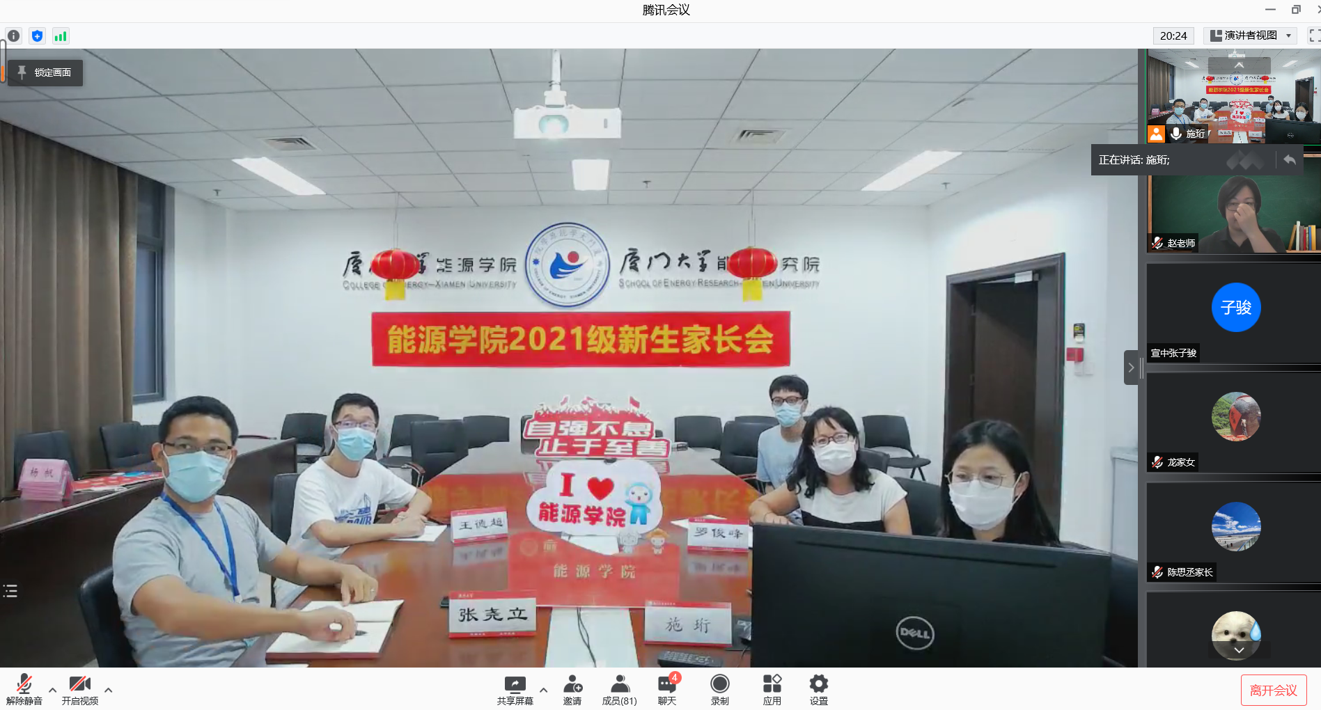 施珩老师介绍了能源学院对学生的教育理念和学校针对疫情防控的最新政策。能源学院严抓学风建设、诚信教育;鼓励本科生全面发展,积极参与社会实践、各类竞赛、文体活动、志愿服务、勤工助学、学生组织等服务他人锻炼自我。针对厦门近期的疫情形势,施老师向家长们说明学校的教学工作已从线下转移到线上,并实行闭环式管理,师生非必要不出校。学校已组织三轮全员核酸检测,无一人呈阳性。施老师还对中秋、国庆“双节”安排作出了说明,中秋、国庆当天分别放假一天,希望同学们留校过节,学校为大家准备了线上中秋晚会,也将为每位同学送上月饼。