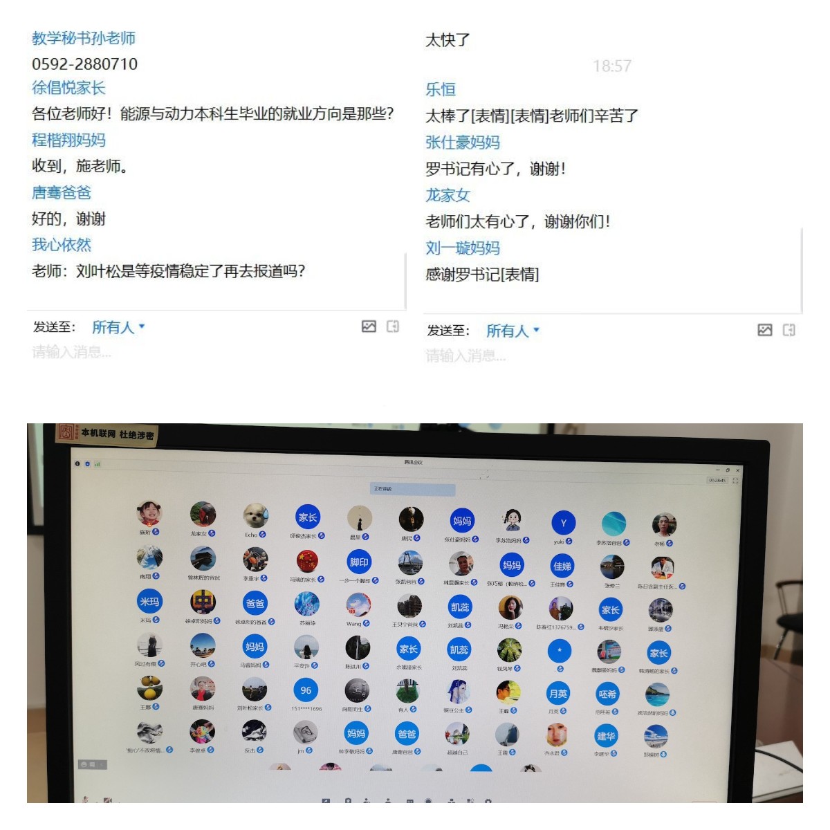 线上家长会还预留了家长与老师的交流互动的时间,家长们对学生专业分流、就业方向以及宿舍用水、医保办理等生活问题提出了疑问,赵英汝老师在线上主要承担了答疑工作,就专业选择和专业前景等问题为家长们做出了细致的解答,几位老师也对共同家长提出的问题耐心地一一解答。
