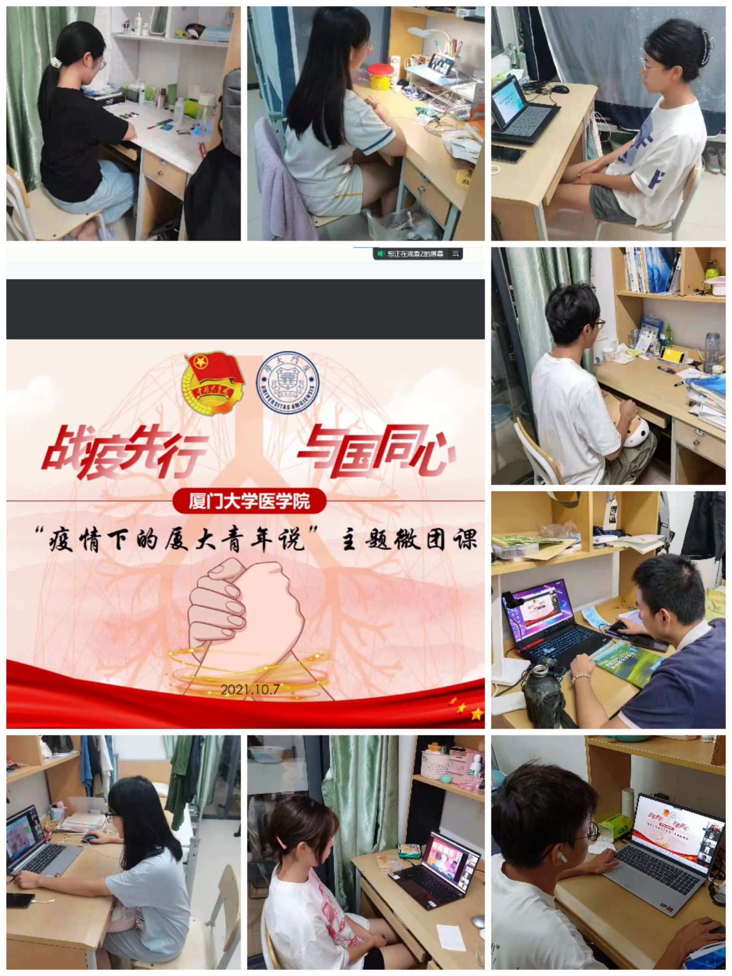 为充分用好疫情防控这一思政课“鲜活教材”,10月7日19点30分,一场别开生面的青春战“疫”云团课——“家国情怀,青年担当”如期举行。本期云团课由校团委、医学院党委联合主办,医学院团委承办,厦大附属第一医院教务科主任黄正接、附属中山医院主任医师张孝斌,附属翔安医院护士长马鑫、主管护师张楠担任主讲嘉宾,生动讲述战“疫”一线感人故事。校团委副书记梁振伟、医学院党委副书记王坤钟,医学院辅导员及2021级全体新生齐聚“云端”,共话使命担当。