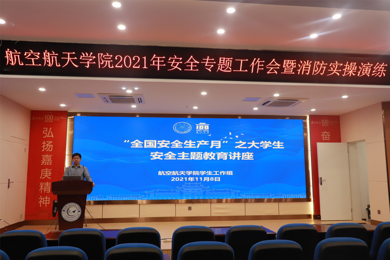 11月8日下午,在航空航天学院报告厅,学院团委副书记倪建超结合《中华人民共和国国家安全法》及学校相关制度条例,提醒同学提高安全意识,筑牢安全防线。他介绍学校、学院疫情常态化下学生防控制度,提醒疫情防控守则和有关注意事项,要求学生坚持每日健康打卡;通报学生受诈骗的典型案例,提醒同学谨防诈骗;强调严禁电动车带入学生公寓楼栋和实验室充电;分析典型的消防安全案例、通报实验室存在安全隐患的案例,引导学生严格遵守实验室安全管理规定,保障实验室安全和消防安全。