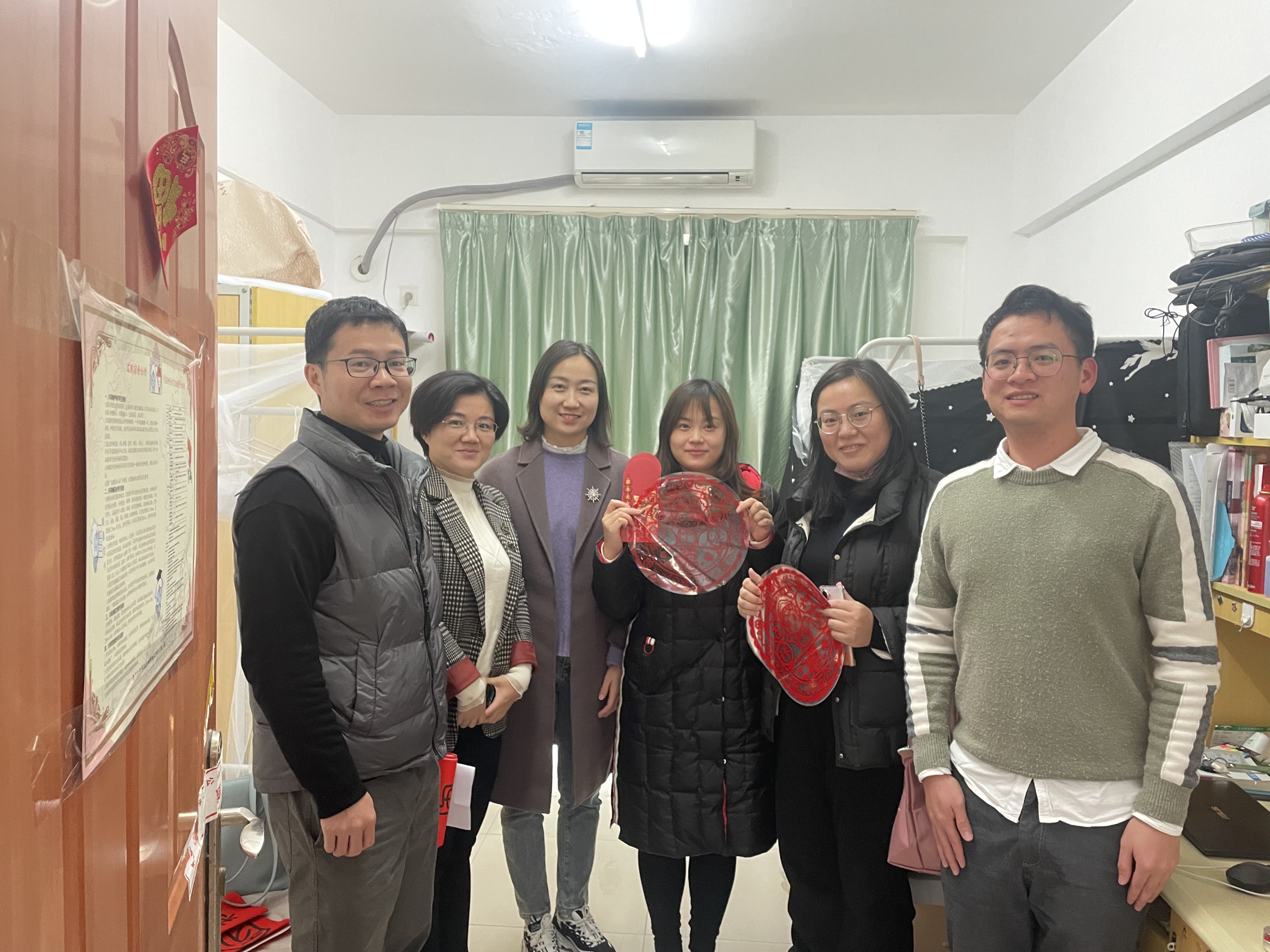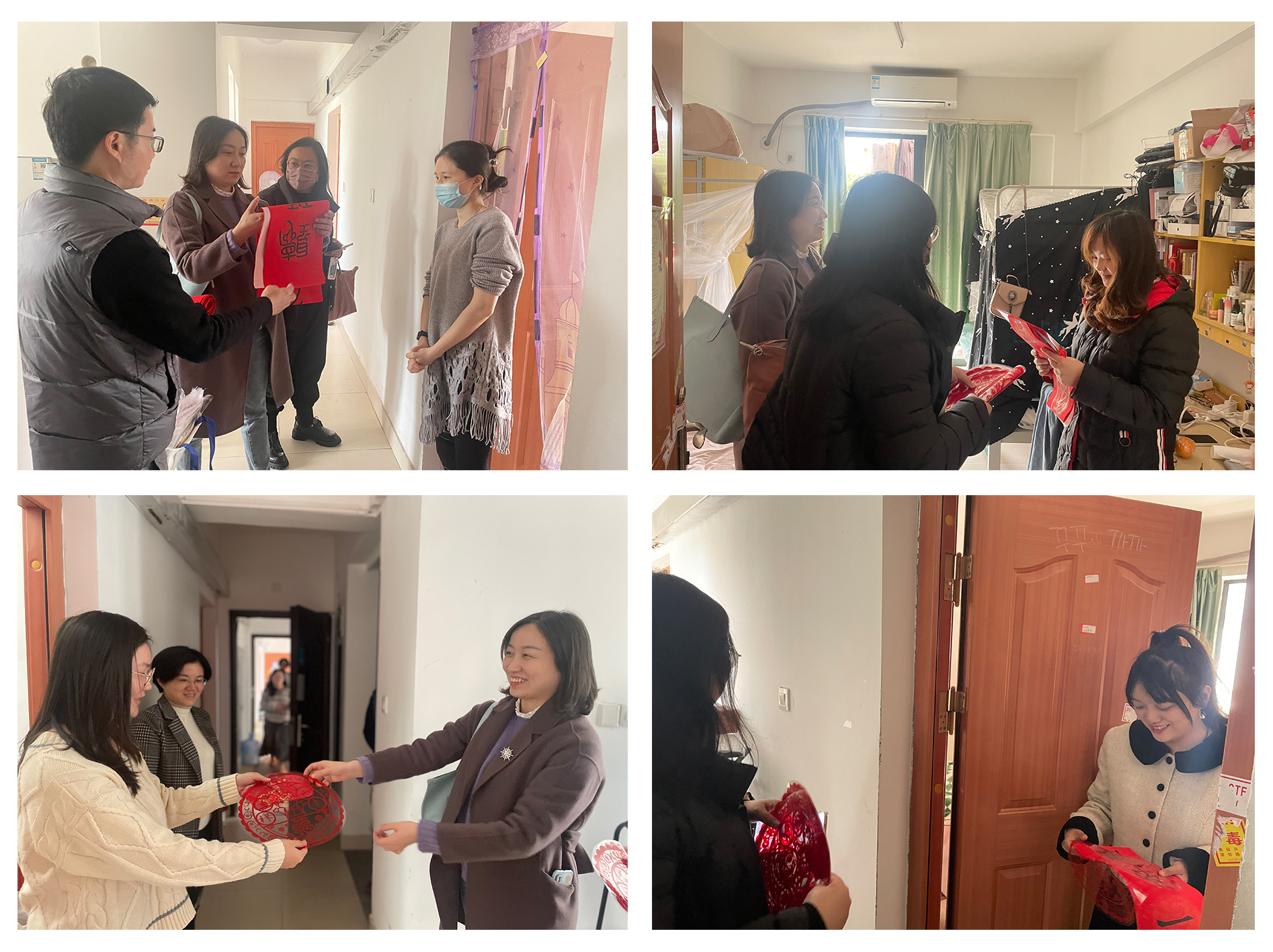 假期新启,新春将临。为加强对留校学生的安全教育,确保留校学生度过一个平安健康、充实而有意义的寒假与春节,1月17日下午,国际中文教育学院/海外教育学院党委副书记吴荻、中外语言交流合作中心副主任、“一站式”学生社区兼职辅导员何冬梅、团委书记陈艺新、辅导员关丽文走访学生宿舍,亲切慰问了我院寒假留校学生,并送上新春祝福,发放春联、窗花等节日小礼包。