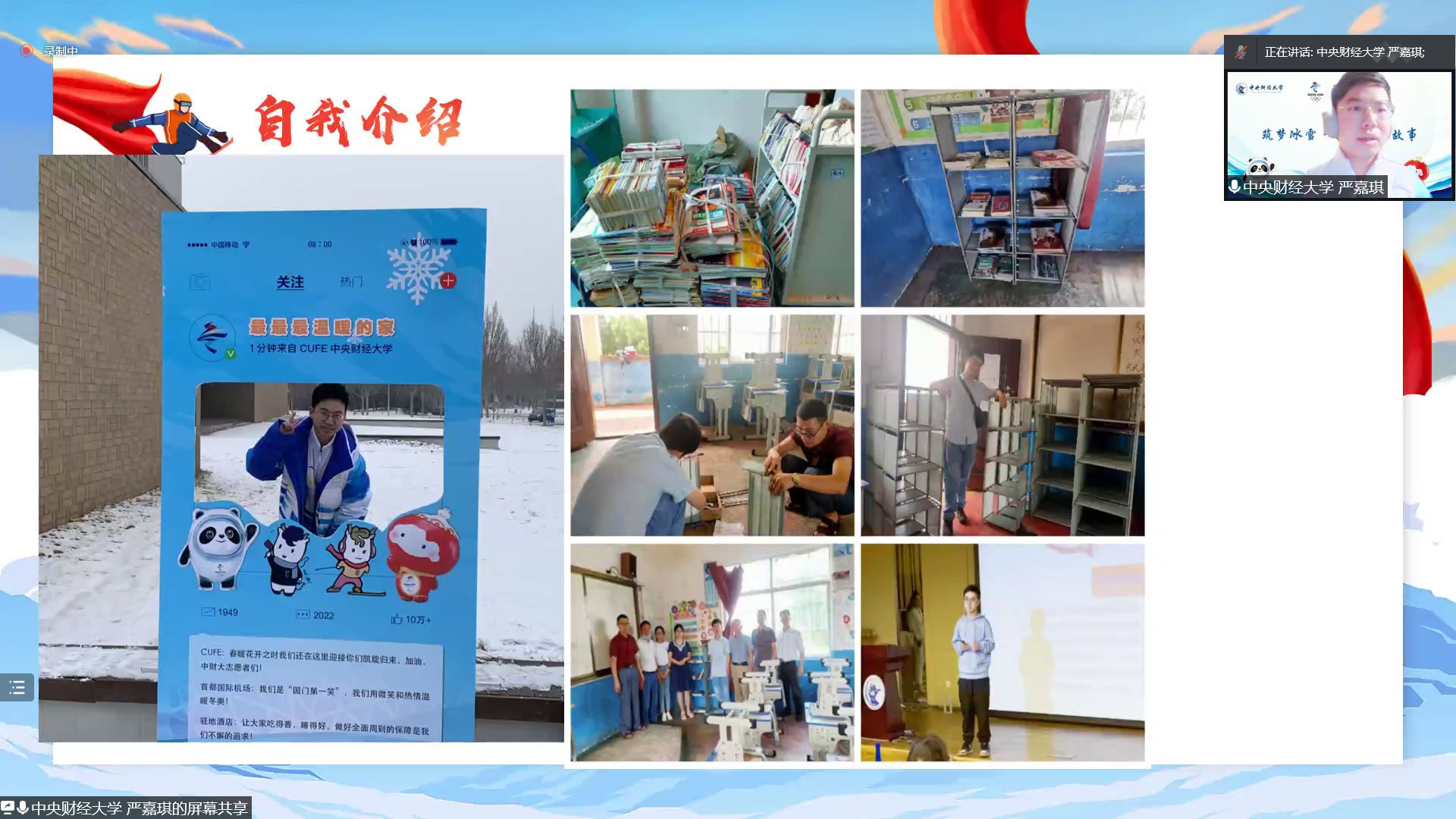 首先,三位中央财经大学的冬奥志愿者代表分享了他们的志愿服务经历。