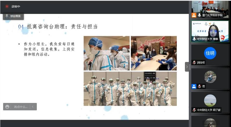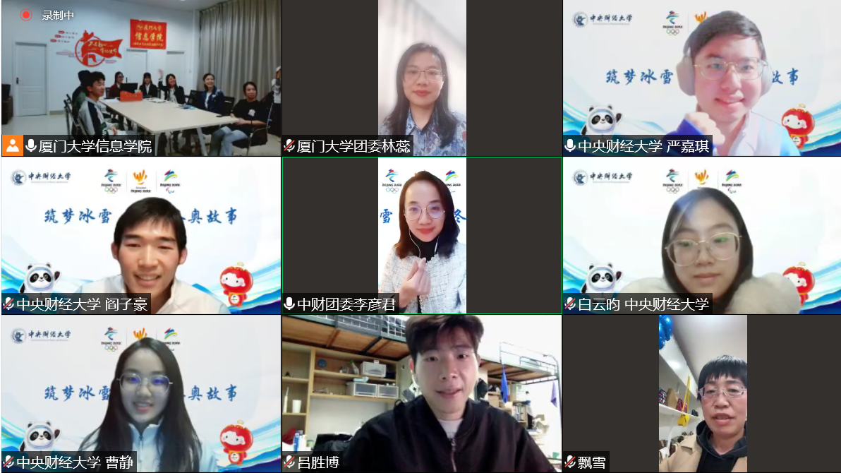 出席本次交流会的有中央财经大学校团委副书记李彦君、基层组织建设科科长陈妮娜、青年工作指导中心白云昀,厦门大学校团委副书记林蕊、信息学院团委副书记刘茜、辅导员贾君,以及中央财经大学冬奥志愿者代表曹静、严嘉琪、阎子豪,厦门大学志愿者代表赵睿。会议由陈艺雅同学主持。我院20、21级学生代表也通过线上方式参与本次活动。