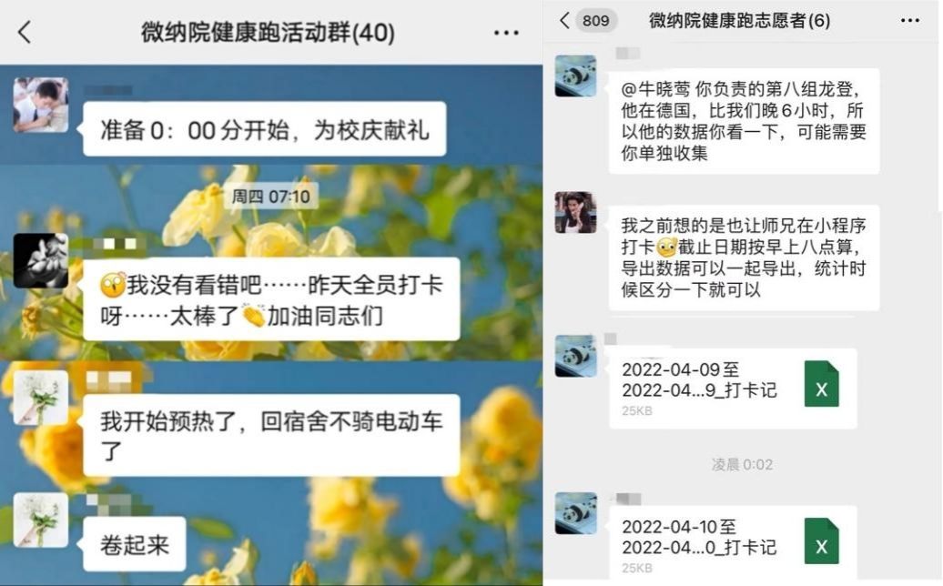 4月6日,在校庆之日活动正式起跑,第一天全员跑步打卡率达到100%,至今开跑5天仍保持75%以上的打卡率,全员累计跑步总公里数高达570余公里。活动为体现公平公正原则,还设立5人师生“裁判团”,在审核所有跑者的打卡数据同时,逢周一公布汇总的上周各位跑者跑步公里数及队伍排名,在激烈的排行比拼下,参赛的跑者们斗志昂扬、冲劲十足,每天在办公室、学生工作间纷纷议论昨天跑步情况;每晚在微信群里互相加油鼓劲、坚持在打卡小程序上传自己的跑步数据,跑步已逐渐成为大家日常生活的一部分。
