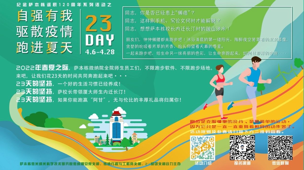 为响应“每天锻炼一小时,健康工作五十年,幸福生活一辈子”的健康理念,激励广大师生继承与弘扬以萨本栋校长为代表的自强精神,驱散疫情的阴霾、共迎春暖花开之时,时值萨本栋校长诞辰120周年和厦门大学校庆101周年之际,微纳翔安党支部、微纳行程与工程党支部、微纳 21级团支部联合组织面向全院师生开展“自强有我,驱散疫情,跑进夏天”健身跑活动,鼓励师生员工在闲暇之余走出办公室和实验室,投入到体育运动中去,以更好的精神状态投入到工作与学习中。