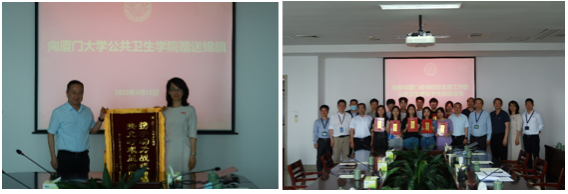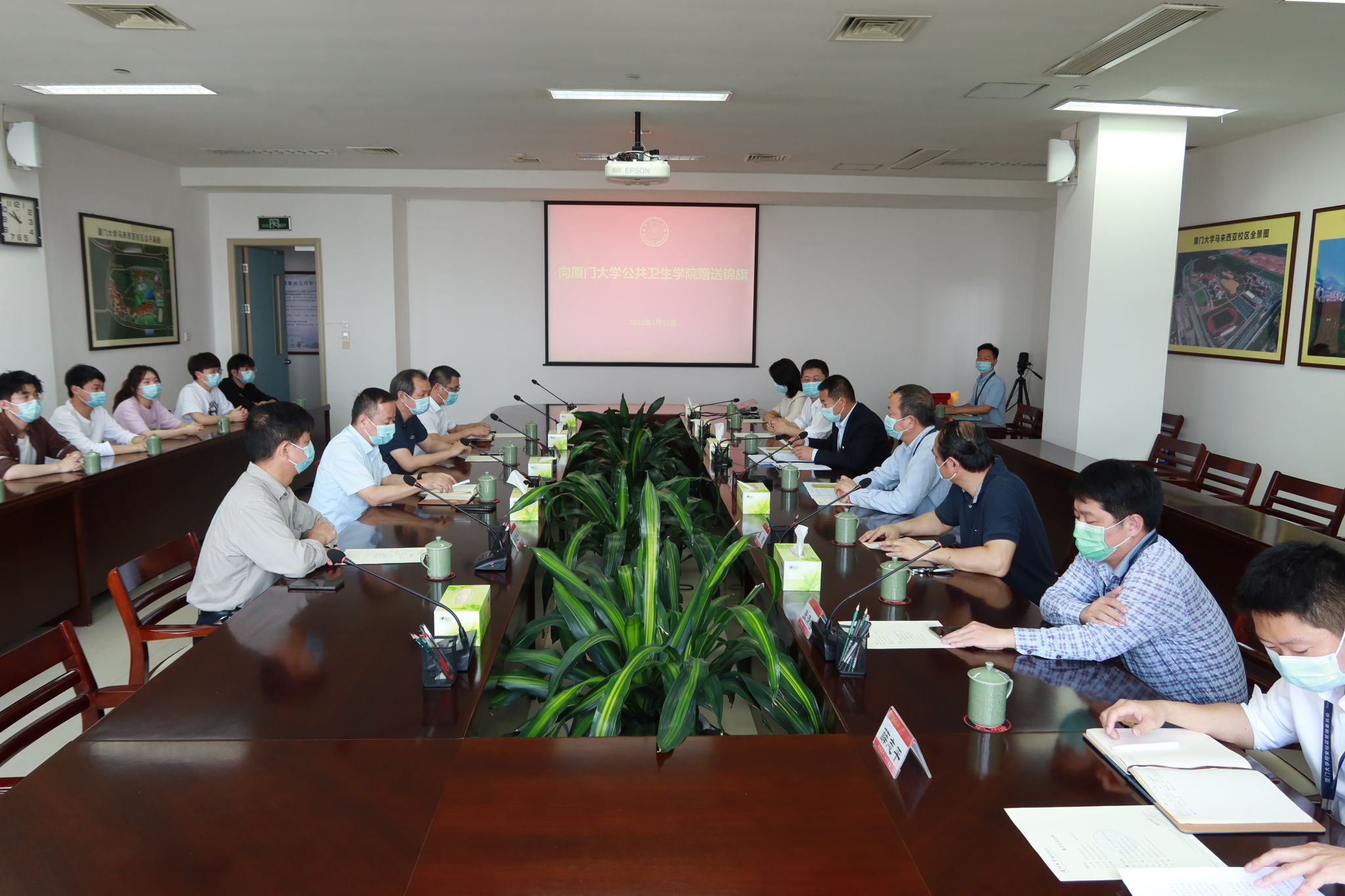 会后,洪求瑛代表翔安区应对新冠肺炎疫情工作指挥部向公共卫生学院赠送锦旗一面;洪求瑛,翔安区卫健局局长纪华期,翔安区卫健局副局长孙进兴,翔安区疾控中心主任苏辉耀共同为参与翔安区疫情防控志愿工作的公共卫生学院学生颁发证书。翔安校区办公室主任薛志平、学生办主任张清榕、公共卫生学院党委副书记庄曦参加活动。
