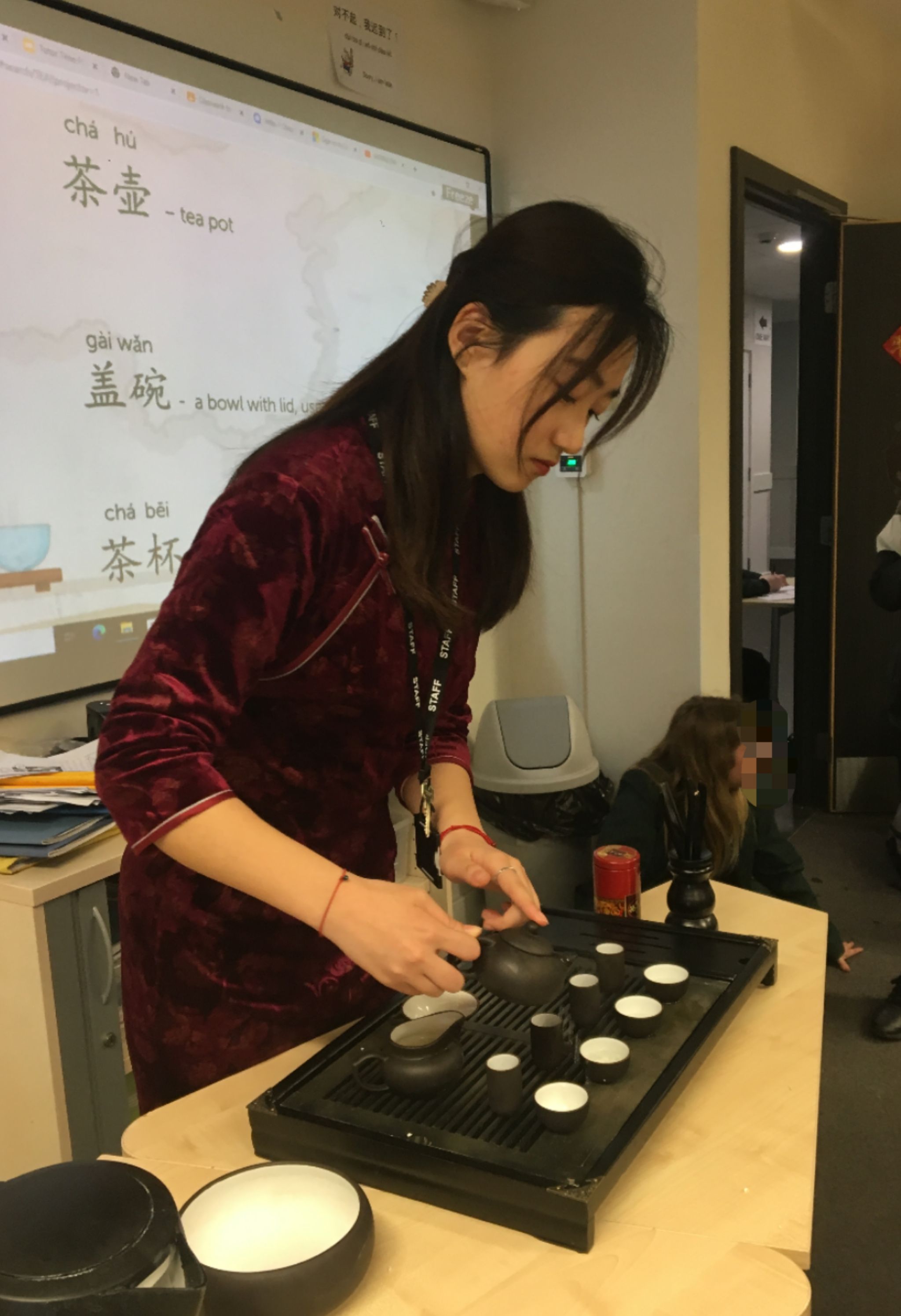 (图为张枫茹在南安普顿孔子学院教授茶艺课)
