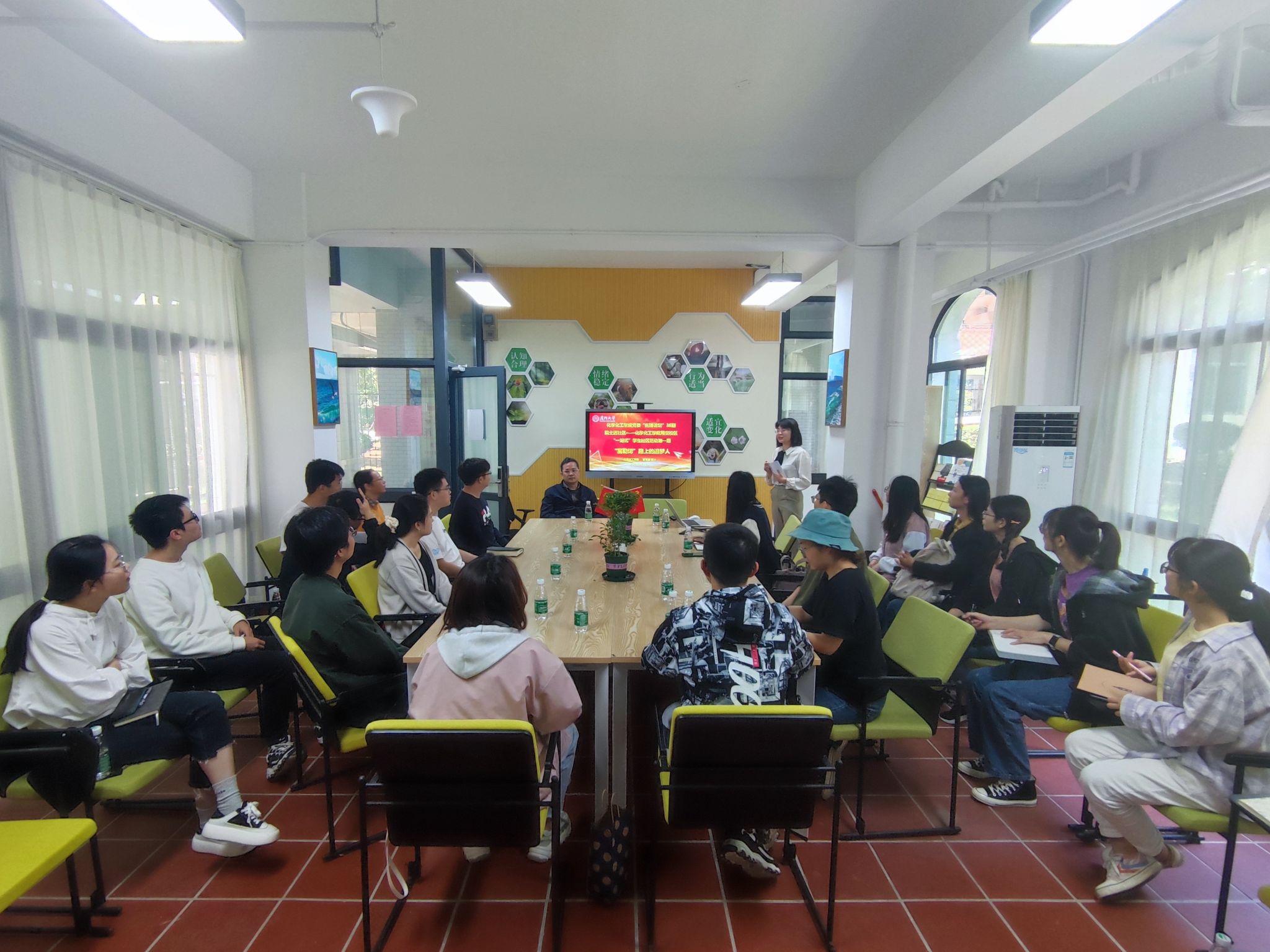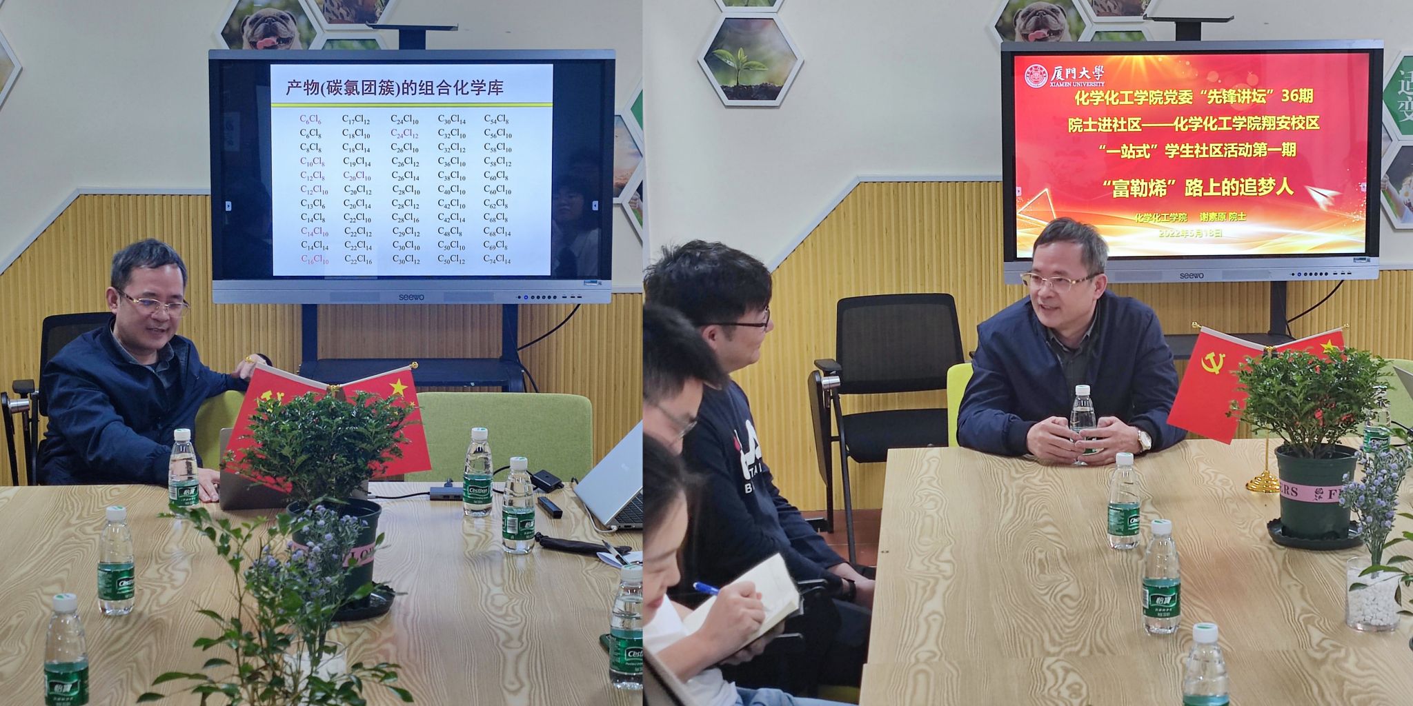 2022年5月18日上午,全国高校黄大年教师团队成员之一、化学化工学院谢素原院士深入翔安校区“一站式”学生社区,作为主讲嘉宾参与化学化工学院党委第36期“先锋讲坛”暨化学化工学院翔安校区“一站式”学生社区活动第一期——“富勒烯”路上的追梦人。本次活动以师生互动交流形式展开,学院党委副书记聂鑫、化学化工学院本科生、硕士生、博士生均积极参与其中,由辅导员王慧主持。