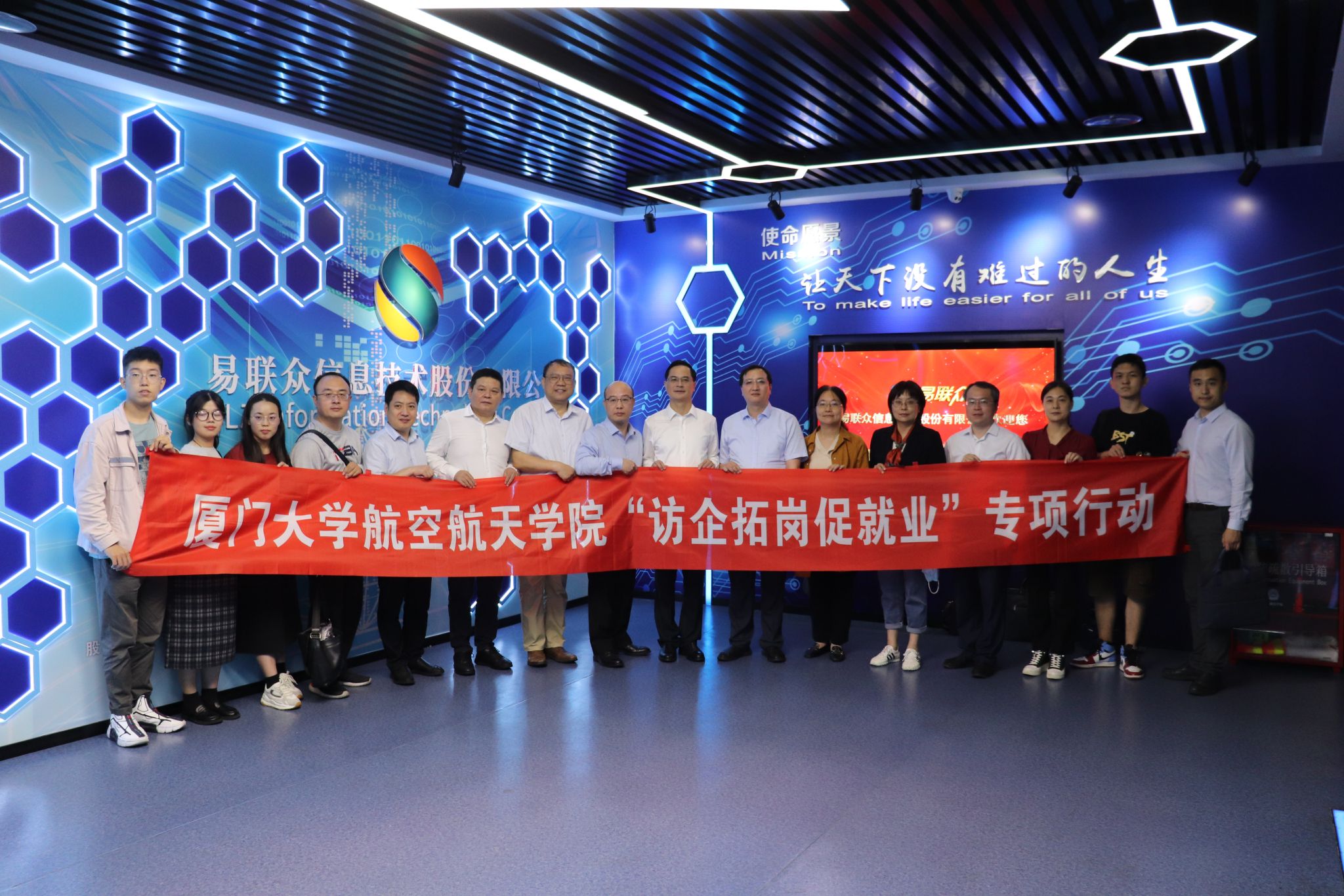 为深入促进毕业生就业工作,加强与用人单位的交流合作,建立校企“协同育人”长效机制,5月24日下午,厦门大学党委常委、副校长邱伟杰,航空航天学院党委书记王康平,党委副书记林蔚,副院长王颖教授,学院党委委员、自动化教工党支部书记、系主任洪文兴教授,学院师生代表一行赴易联众信息技术股份有限公司拓岗调研。易联众集团CEO吴梁斌,副董事长、执行总裁黄文灿,副总裁饶昱红,下辖公司负责人及院友接待了调研团。