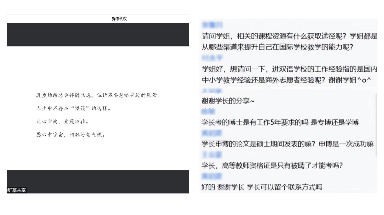 既有公立学校工作体验又拥有国际学校工作经验的2018级赵萱萱学姐用亲身经历告诉同学们:适合自己的工作才是好的工作。她详细介绍了国际学校的类型、应聘渠道、工作体验和待遇与发展。在谈到是否一定要去激烈竞争教师编制时,学姐给大家提供了新的就业思路,建议大家多尝试、多体验,勇敢追寻适合自己的就业方向。
