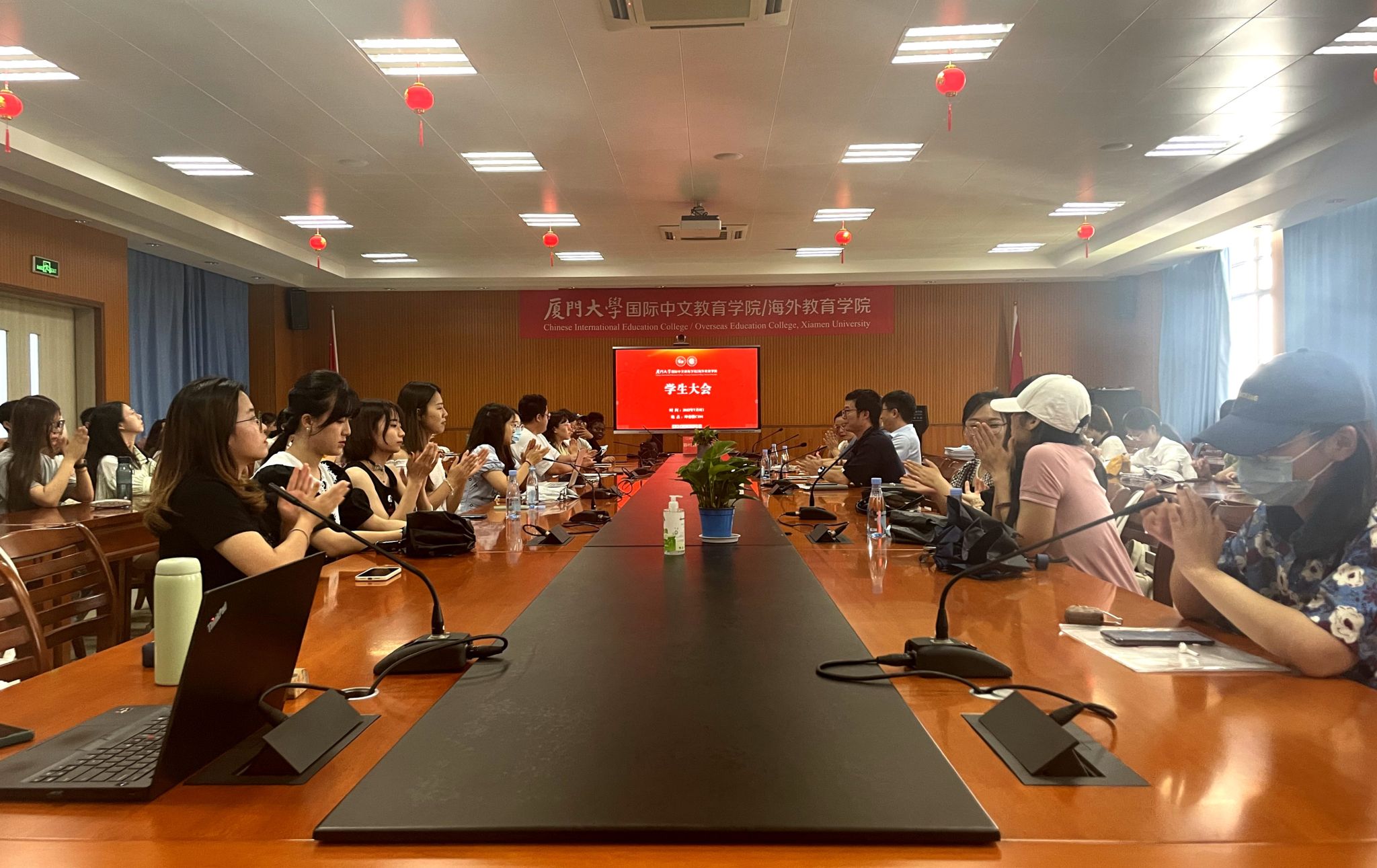 7月8日下午,厦门大学国际中文教育学院/海外教育学院全体学生大会在翔安校区坤銮楼C104会议室举行。参加会议的有学院党委副书记林明华、各年级辅导员以及全体在校学生,会议由学院团委书记陈艺新主持。
