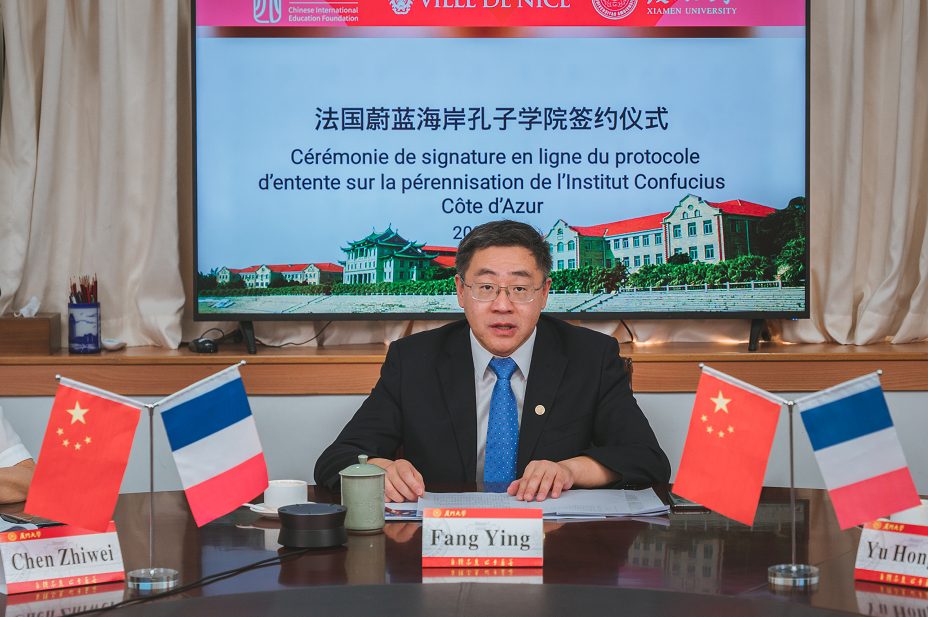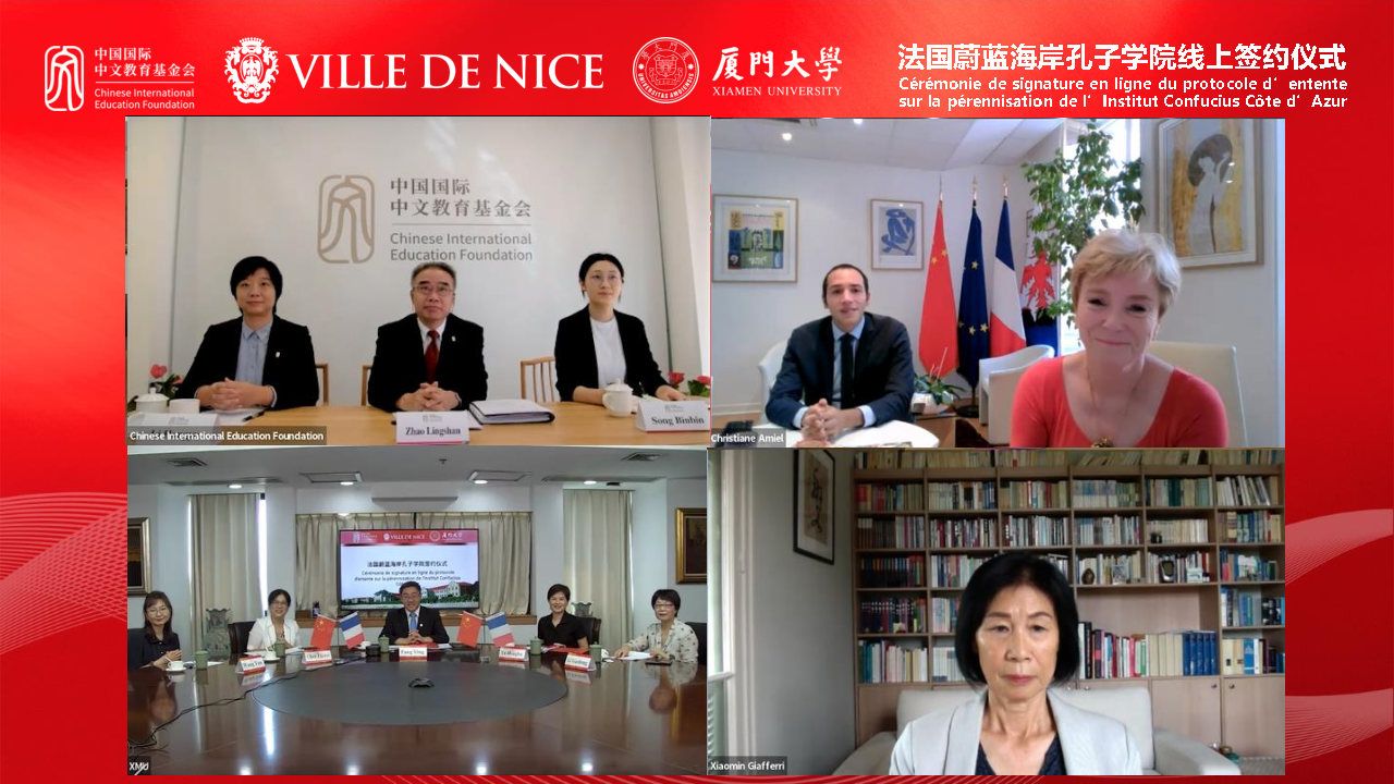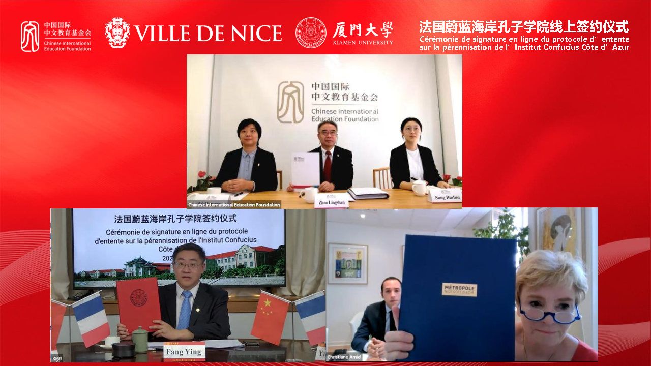北京时间9月28日下午,时值第2573个孔子诞辰日,我校与中国国际中文教育基金会、法国尼斯市三方共建法国蔚蓝海岸孔子学院签约仪式在线上顺利举行。中国国际中文教育基金会秘书长赵灵山、法国尼斯市政府分管国际关系副市长克里斯蒂安·阿米尔(Christiane AMIEL)、我校校长助理方颖分别代表三方出席签约仪式并签署合作协议。仪式由厦门大学国际中文教育学院/海外教育学院陈志伟院长主持。