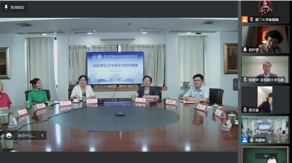 2022年9月28日,由厦大语合中心教工党支部牵头组织,国际中文教育学院/海外教育学院党委“为民办实事”重点项目——第六次“云端”中方院长座谈会如期开展。厦门大学国际中文教育学院/海外教育学院党委书记范丽、副书记林明华,厦大共建孔院全体中方院长及候任院长,厦大语合中心相关人员参会。会议由国际中文教育学院/海外教育学院院长陈志伟主持。