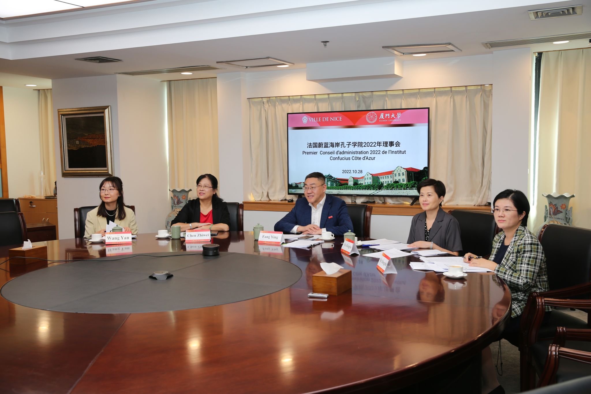 北京时间2022年10月28日下午,我校共建法国蔚蓝海岸孔子学院举行2022年视频理事会。蔚蓝海岸大学第一副校长、孔院前任理事长埃马纽埃尔·特里克(Emmanuel TRIC),我校校长助理方颖出席并致辞。尼斯市政府国际关系局亚洲事务处处长张明(Cyril Doutre),蔚蓝海岸大学中文系前系主任、孔子学院法方创始院长黄晓敏(Xiaomin GIAFFERRI),我校国际中文教育学院院长陈志伟,海外办学办执行主任、国际处副处长余宏波等理事会成员共同参会。一同参会的还有我校中外语言交流合作中心副主任何冬梅、孔子学院中方院长王彦等。