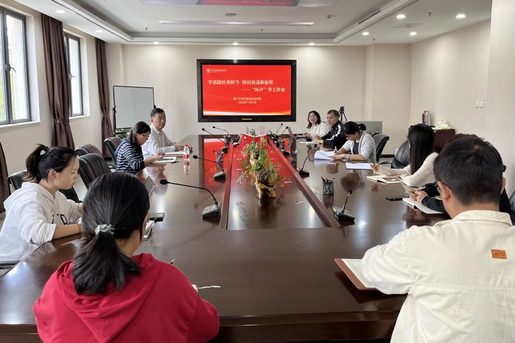 2022年11月7日中午,我院在金泉楼A226举办第一期“环声”学工沙龙,本期沙龙以“学思践悟勇担当,踔厉奋进新征程”为主题。学院党委副书记蔡虎堂、刘莉颖及全体专兼职、党政辅导员参加了沙龙。沙龙由党政辅导员雷欣宇主持。
