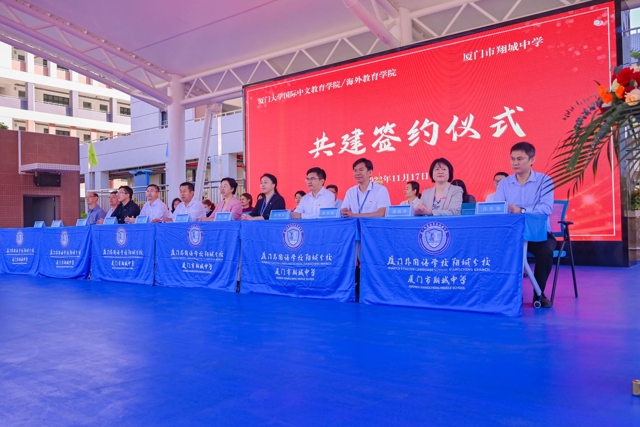 11月17日上午,厦门大学国际中文教育学院/海外教育学院与厦门市翔城中学共建签约仪式在厦门市翔城中学举行。厦门市翔安区教育局副局长李福男、厦门大学翔安校区管委会副主任马龙、学生办主任高斌、教务办主任何海涛、国际中文教育学院党委书记范丽、党委副书记林明华、副院长潘超青与厦门市翔城中学校长苏静、发展顾问谭蔚、副校长黄辉鹏等人出席共建签约仪式。