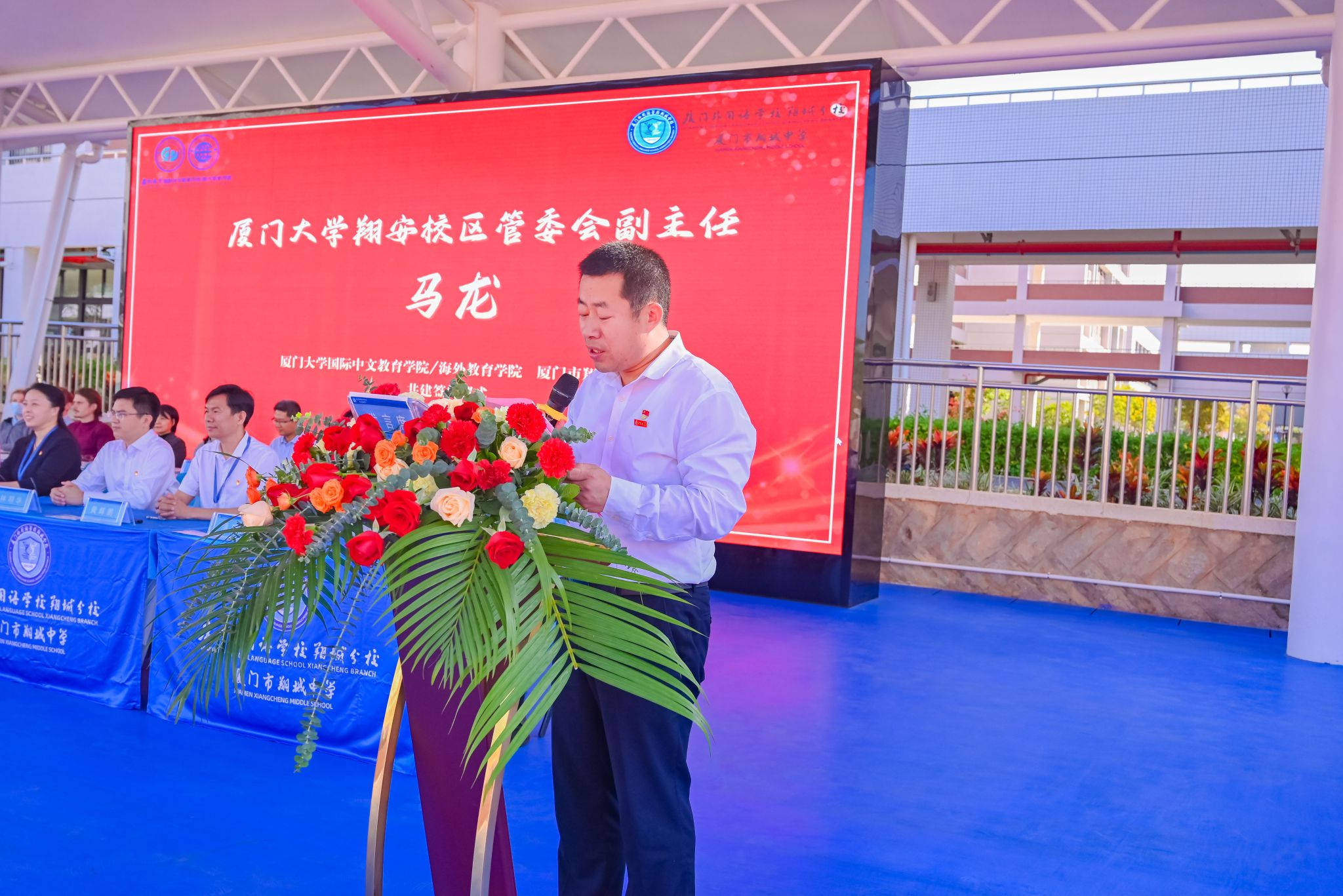 马龙在致辞中表示,厦门大学国际中文教育学院拥有汉语国际教育与中华文化传播并重、学历教育与非学历教育兼备、面授教学与远程教育并举、理论研究与应用开发并行的特色。厦门市翔城中学有着先进的国际融合教育理念和外语特色,双方优势契合,有着广阔的合作前景。此次共建,是学院加强校地合作的又一次探索,同时也是我校加快推进教育助力乡村振兴的一项重要举措。相信双方能立足资源优势,找准合作契合点,加强资源互补、人才交流和社会志愿服务等多方面合作,办好党建教育基地、实习实践基地、志愿服务基地,扎实推进共建取得实效。