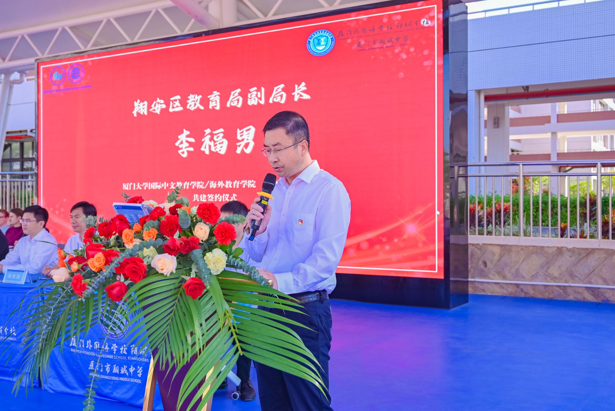 李福男在致辞中表达了通过进一步深化与著名高校合作共建的方式,努力为翔安人民办出家门口的好学校的期许。厦门市翔城中学以高标准、高要求建设,高起点、高水平办学,创校、建校体现“三优”导向:硬件优、师资优、理念优。这次与厦门大学国际中文教育学院签订合作共建协议,开展“支部共建、教授进课堂,毕业生到校实习、学生到厦大研学、海外留学生参与语言角”等活动,通过名校“加持”、智库“加持”,这所翔安区高起点新建校未来可期,努力创造翔安初中教育新高度。