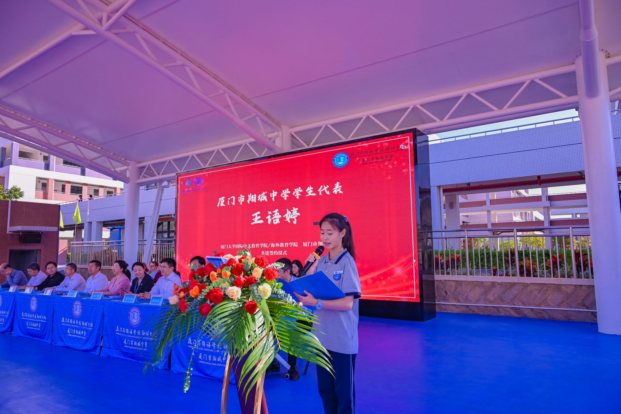 翔城中学学生代表王语婷表达了母校与厦门大学国际中文教育学院合作共建的憧憬,畅想这一次美丽的相遇一定会成就不少翔城学子的梦想。在不久的将来,足不出校便可以感受到厦大带来的国际文化活力,感受更加广阔的文化视野。