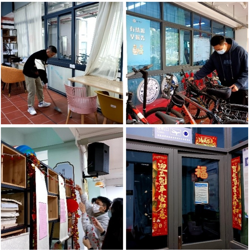 扫去一年尘晦,张贴新年新气象。“尘”与“陈”谐音,新春扫尘即“除陈迎新”。当天下午,留校同学在映雪、博学的宿舍、“一站式”空间积极开展除尘布新等工作。整理自行车、扫地擦玻璃、整理桌椅和书架,同学们将去年的春联换下,贴上对新一年的美好祝愿。