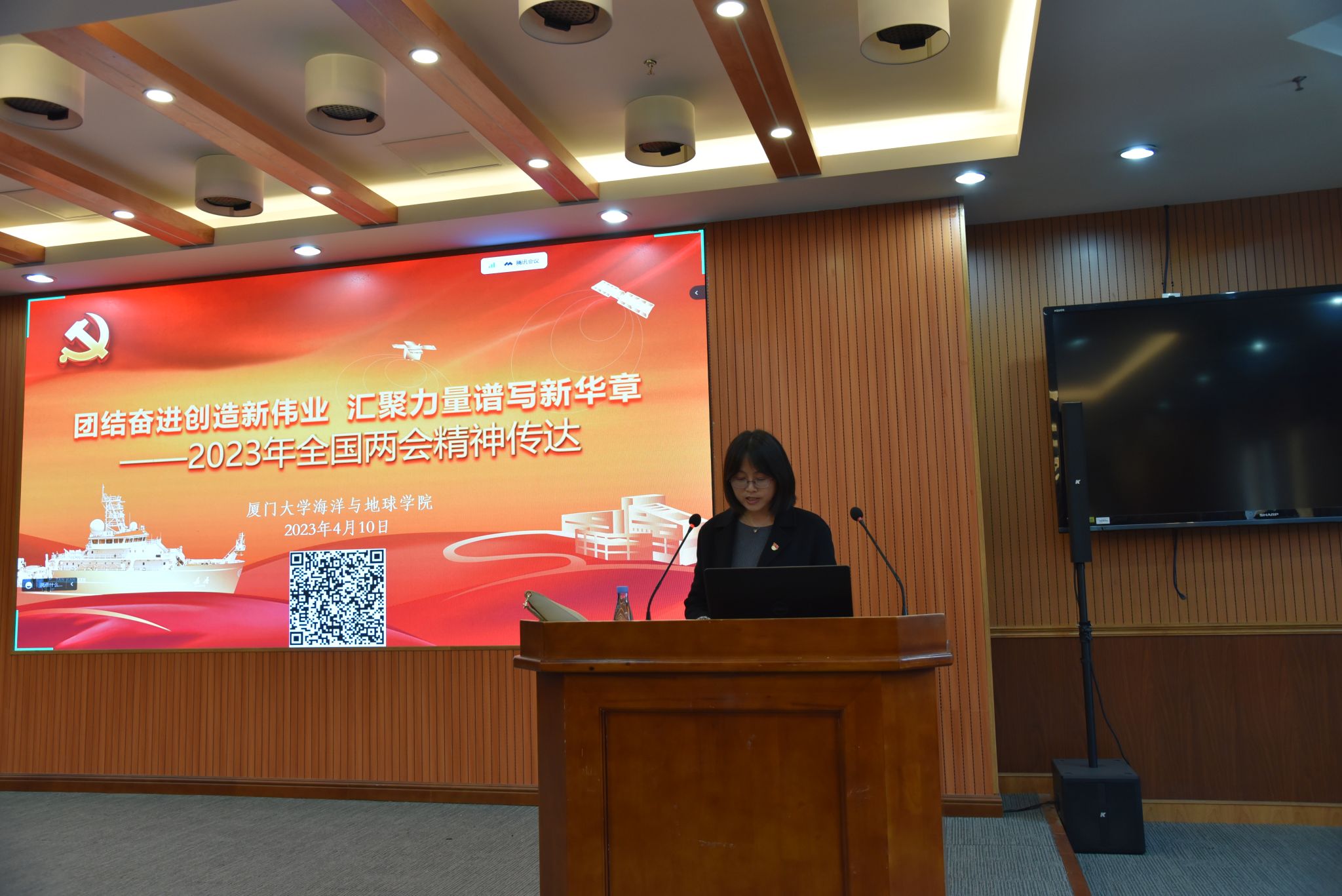 为深入学习贯彻2023年全国两会精神,把握精神实质、统一思想行动,4月10日下午,海洋与地球学院在希平楼C2-403举行传达学习2023年全国两会精神报告会,第十四届全国人大代表、厦门大学经济学院潘越教授作题为《团结奋进创造新伟业 汇聚力量谱写新华章——2023年全国两会精神传达》的专题报告。学院党委理论学习中心组成员、全院教工、学生党支部委员以线上线下相结合的方式参加会议。学院党委副书记唐腾凤主持报告会。