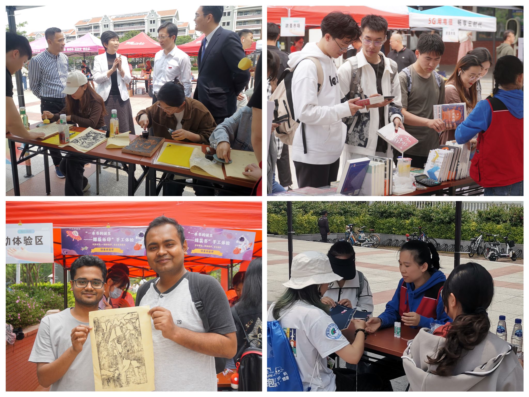 本次活动还在德旺图书馆北厅、竞丰餐厅广场、丰庭餐厅广场等地举办主题书展,增强活动吸引力、互动性和参与感。厦门市新华书店开设了“大学生的第一本书”“厦大人必读的书”“党员必读政治读物”等主题展览,并设有互动体验区、文创与流供区、跳蚤市场区等功能区,为师生提供精品多元的文创产品和手工体验,搭建物尽其用的旧书交换平台。师生积极参与到各类活动中,阅读主题读物,体验雕版拓印、线装书制作……感受着阅读带来的快乐。翔安校区管委会各部门负责人,校区各学院教师代表,厦门市新华书店的工作人员参加活动。