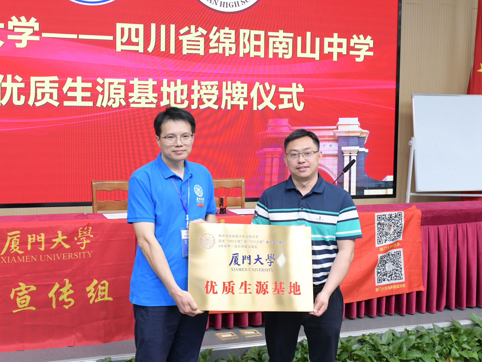 4月20日,宣传组及校友会志愿组一同赴绵阳开展宣讲工作,先后到访了绵阳东辰学校、绵阳南山中学及绵阳中学。宣传组代表学校分别授予绵阳东辰学校及绵阳南山中学“厦门大学优质生源基地”牌匾,双方将以此为契机建立常态化合作关系。已授予“优质生源基地”的绵阳中学近五年更是为我校输送了大量优秀学子。