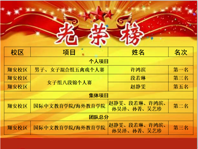本次比赛分为个人单项赛、集体项目赛和团体赛。我院学子参加了翔安校区男子、女子混合组五禽戏个人赛,女子组八段锦个人赛以及集体赛。选手们经过前期的努力训练,在赛场上展现风采,取得优异成绩。