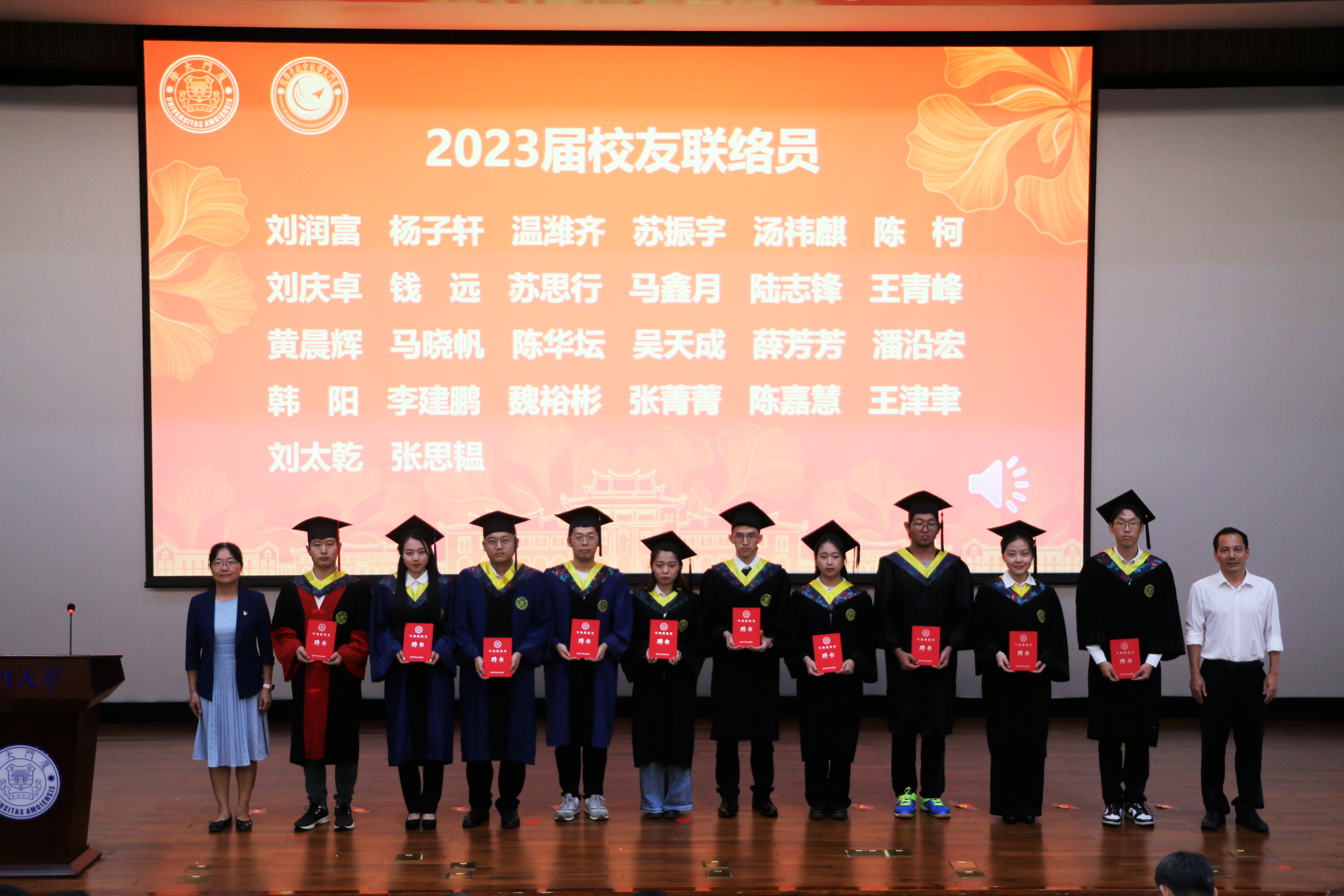 “今天我以母校为荣,明天母校以我为荣”。为加强毕业生与校院的联络,典礼上举行了2023届校友联络员聘任仪式,林蔚、卿新林为他们颁发聘书。
