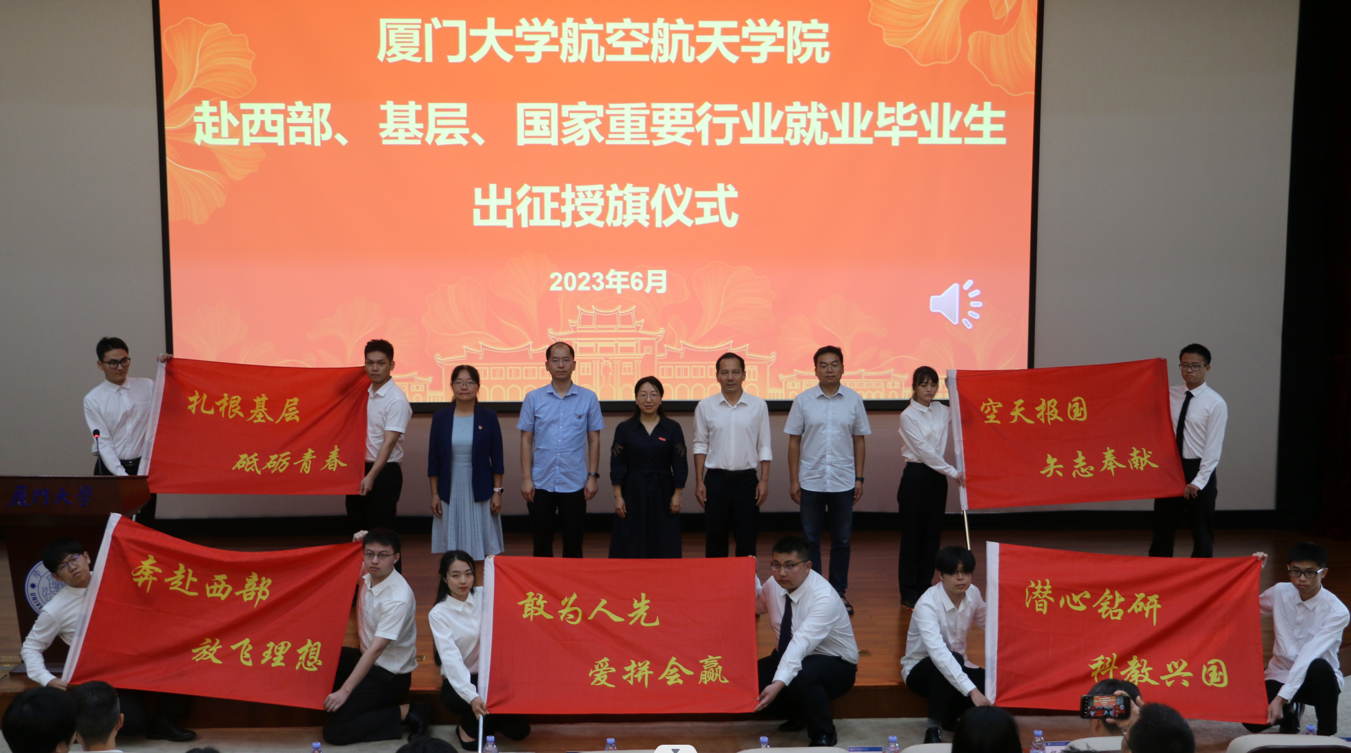 为激励毕业生勇于接受挑战,到国家最需要的行业领域建功立业,典礼上还举行了赴西部、基层、国家重点行业就业毕业生出征授旗仪式,廖志丹、尤延铖、卿新林、林蔚、黄玥为毕业生代表授旗。毕业生们将带着校院师长的殷切期望,脚踏实地、真学实干,想群众之所想,解群众之所盼,让青春在党和人民最需要的地方绽放绚丽之花。