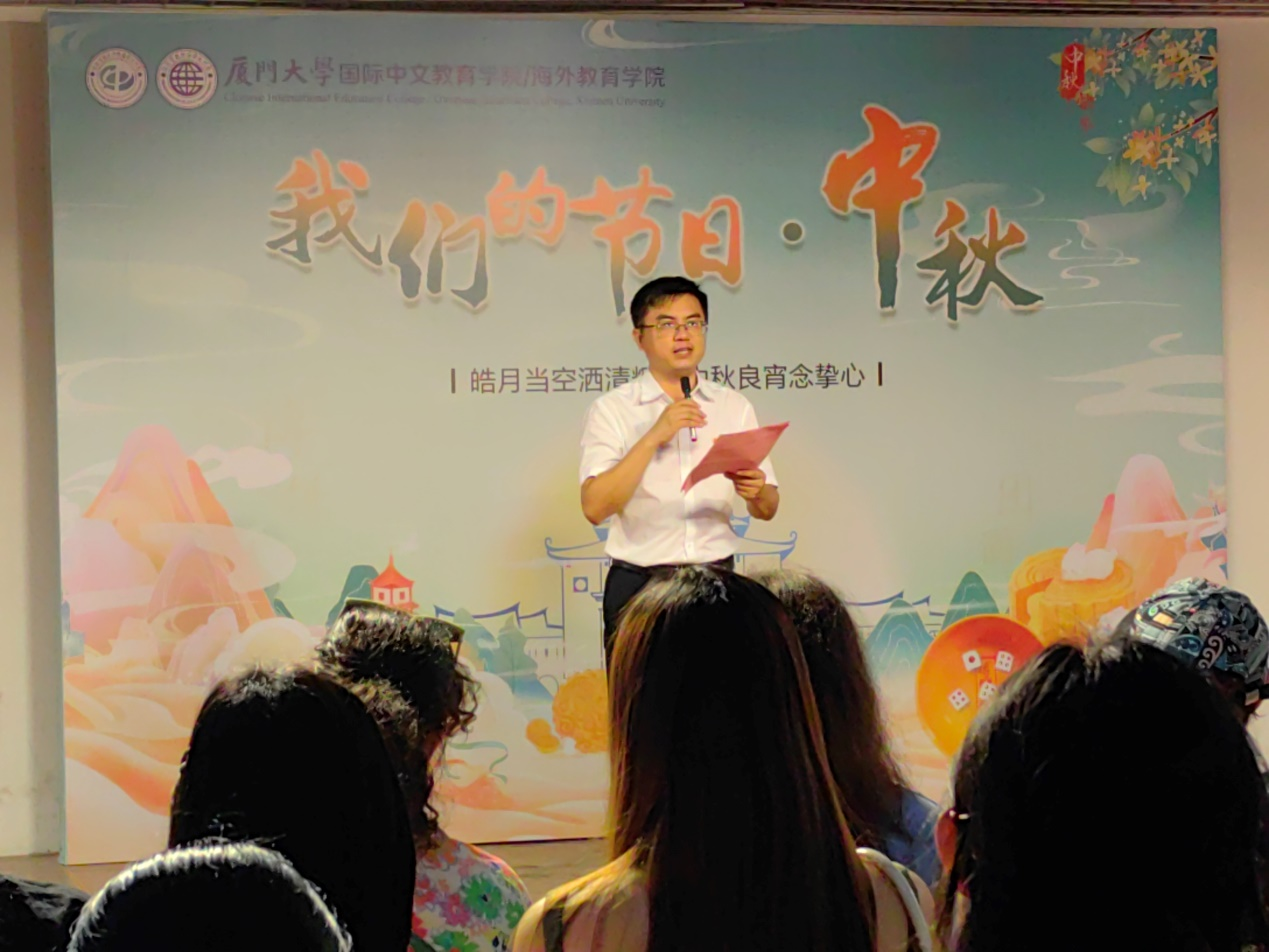 活动伊始,林明华首先致辞。他对新生们的到来表示热烈欢迎,并向大家致以节日的问候。接着,他以中国古典诗词为引,对中秋节的文化内涵进行了阐述,希望各位国内外学生能借此机会感受中华文化的博大精深与源流悠长,并祝愿大家在本次活动中载兴而来、载兴而归。