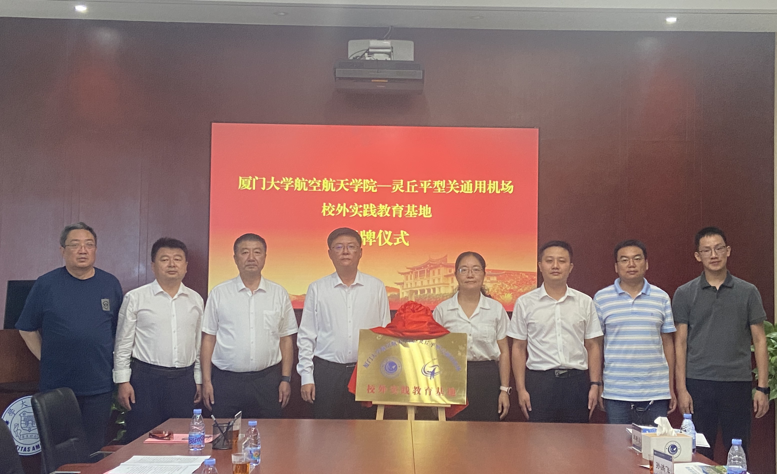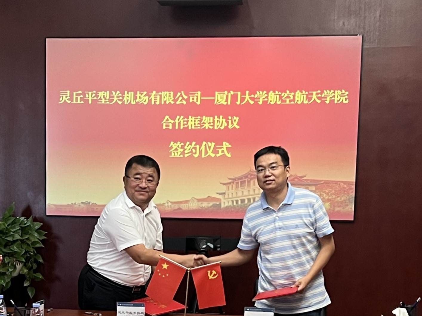 签约仪式前,双方进行了会谈。黄玥从学科建设、人才培养、队伍建设、科学研究等方面介绍了航空航天学院基本情况,钟灵臣介绍了灵丘通航产业园区及相关航空产业情况。随后,黄玥、房卫分别代表航空航天学院、灵丘平型关机场有限公司共同签订合作框架协议。林蔚、周鹏共同为“厦门大学航空航天学院——灵丘平型关通用机场校外实践教育基地”揭牌。