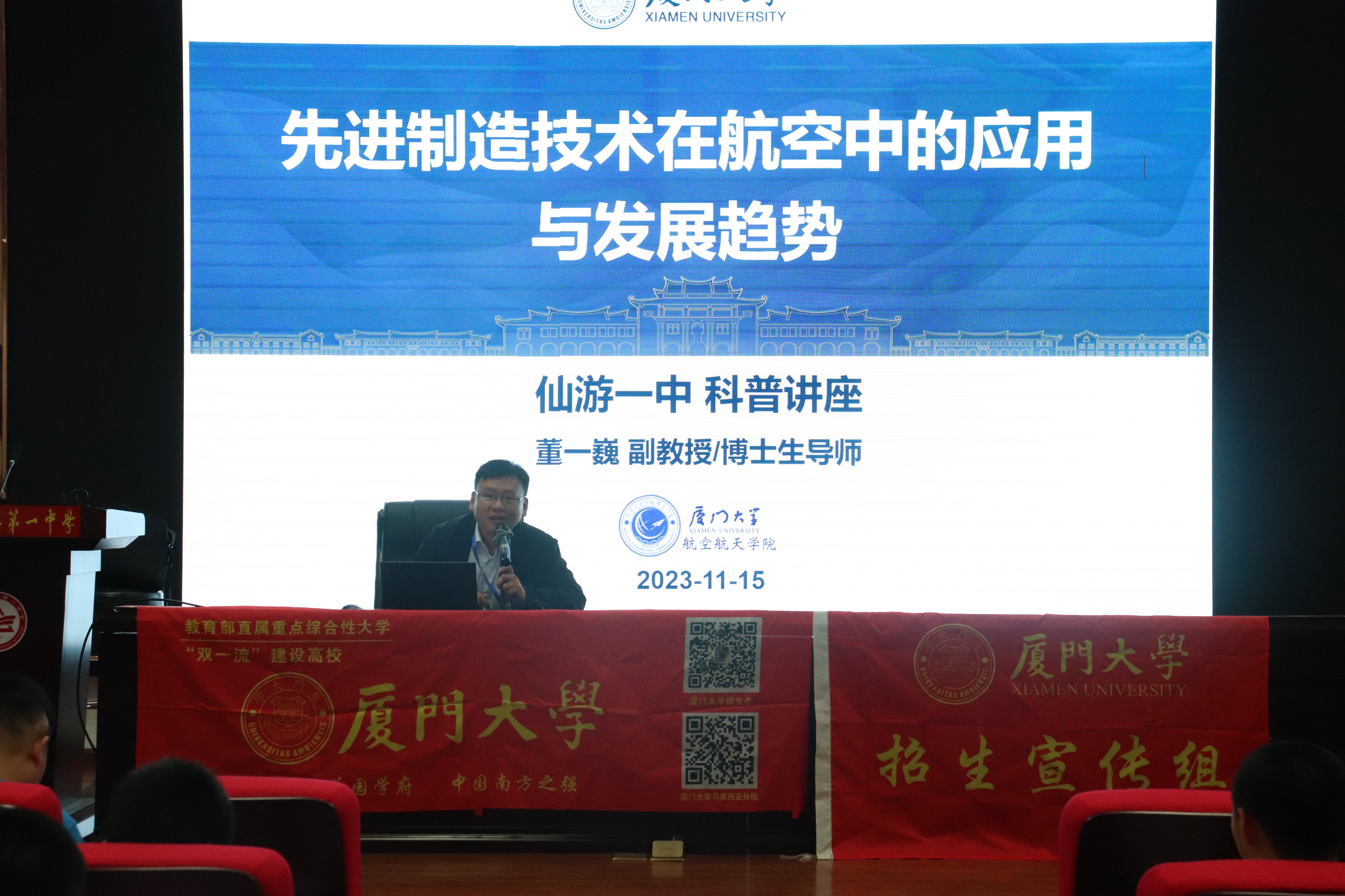 11月15日,厦门大学莆田招生宣传组赴仙游第一中学开展师生座谈交流、“教授进中学”科普讲座等招生宣传活动。仙游一中副校长郑加金、黄建煌,教研室副主任孙桥敏出席有关活动;航空航天学院党委副书记王寒,学院副教授、博士生导师董一巍,学院党委组织员、仙游一中校友张琳等参与宣传活动。