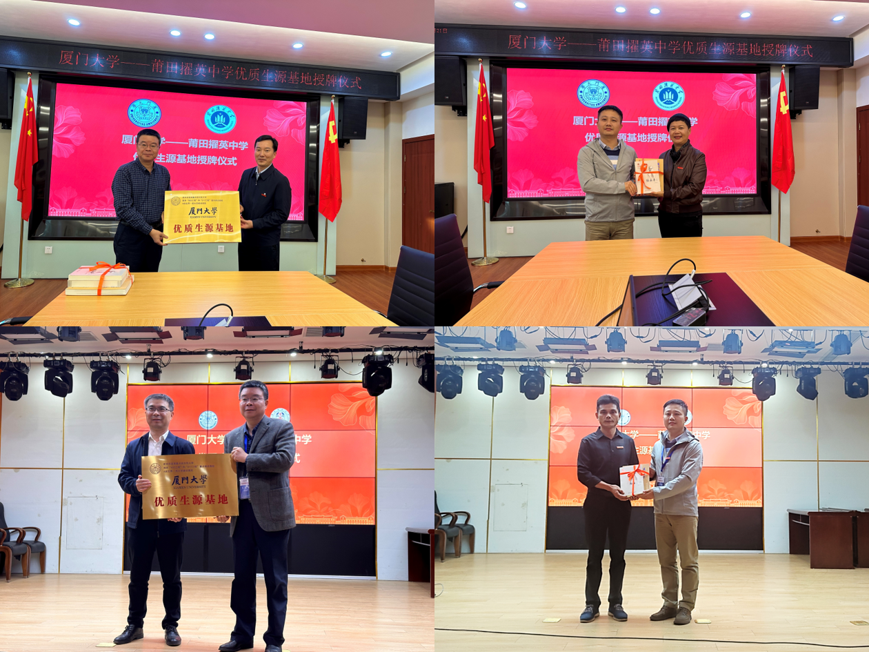 宣传组先后在莆田擢英中学、莆田四中举行“厦门大学优质生源基地”授牌仪式。两所中学作为厦门大学在莆田市的优质生源重要来源校,近5年为厦门大学输送了近百位优秀学生。双方将以授牌为契机建立常态化合作关系,深化交流,共同培养更多高知识、高素质、高能力的人才。在全场师生的见证下,罗思东代表厦门大学向两所学校授予“厦门大学优质生源基地”牌匾,王寒向两校赠送厦大百年校庆系列出版物的部分书籍。