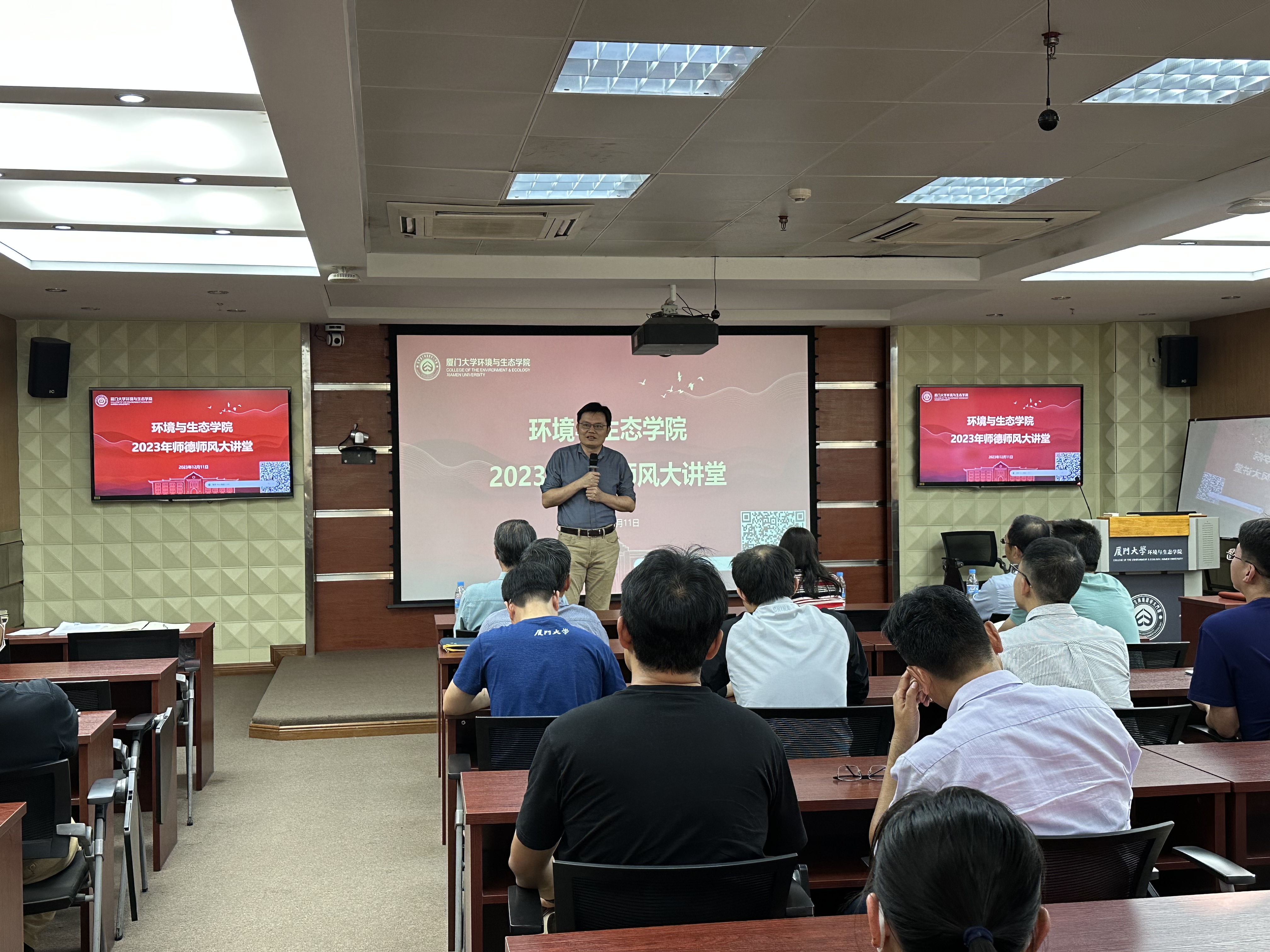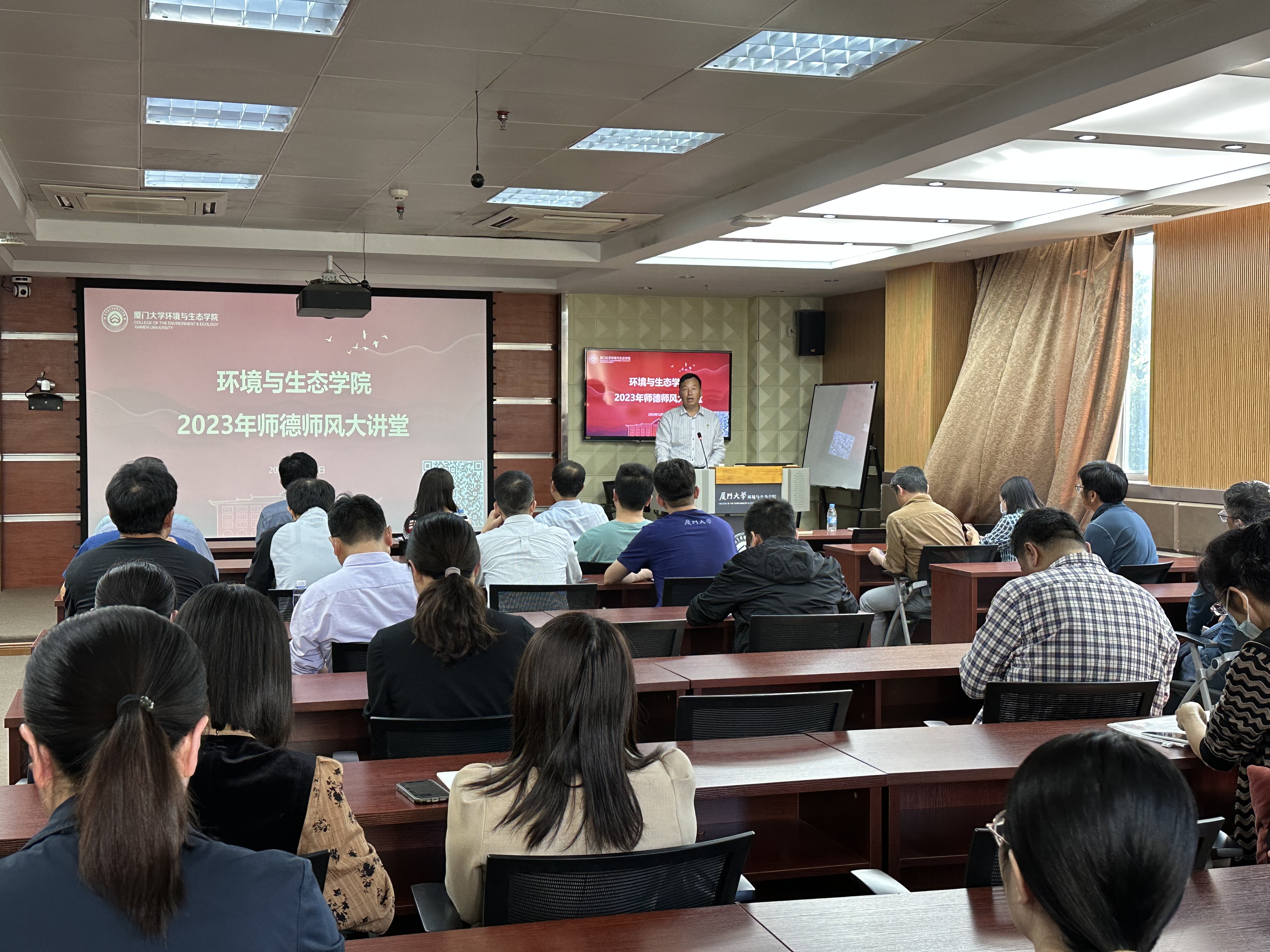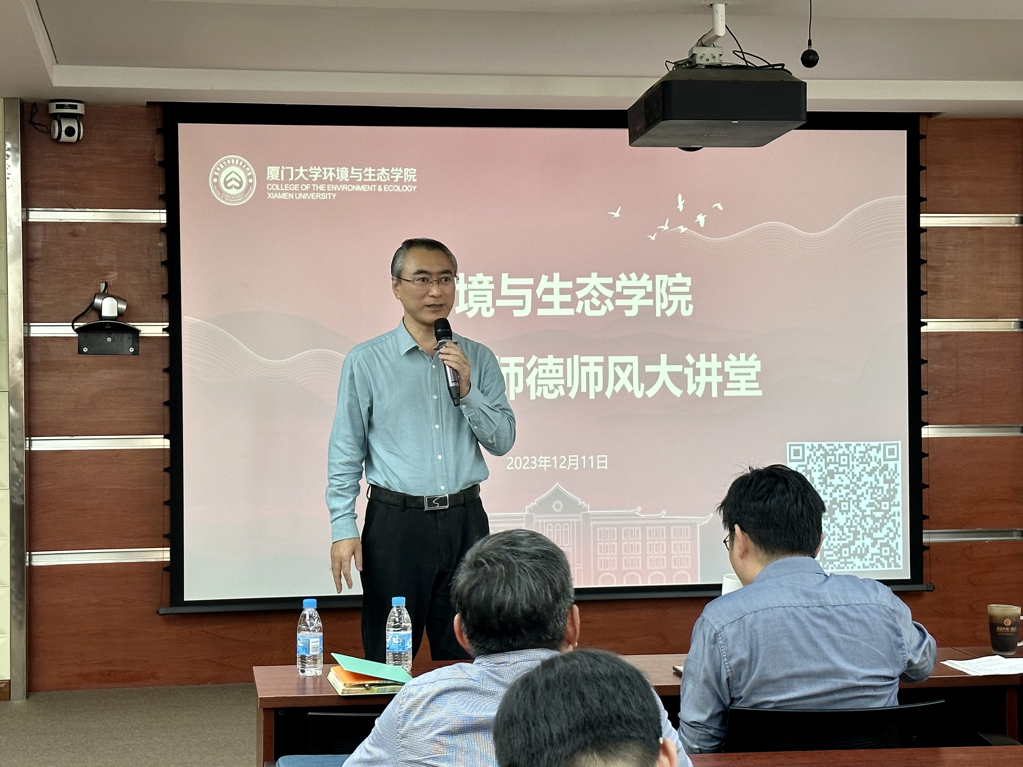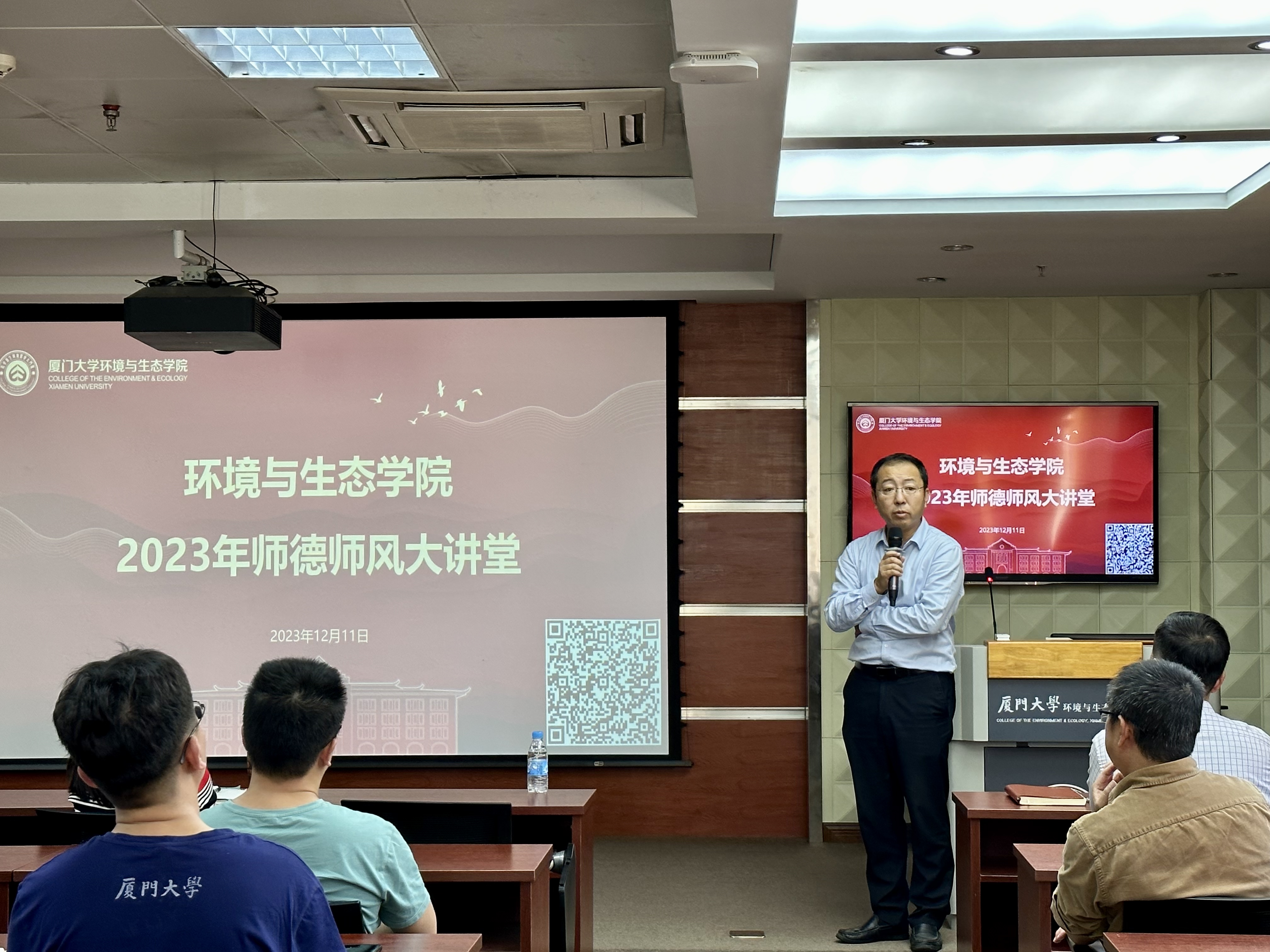 12月11日下午,环境与生态学院在金泉楼A239报告厅举办2023年师德师风讲堂,邀请学院“福建省优秀教师”黄凌风教授和校2023年“我最喜爱的十位老师”获得者于鑫教授围绕“如何做一名好老师”的主题与学院教职工开展交流分享。全院教职工80余人到场聆听。活动由学院党委副书记蔡虎堂主持。