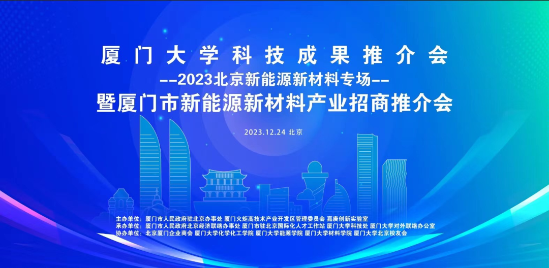 2023年12月24日下午,厦门大学科技成果推介会(2023新能源新材料专场)暨厦门市新能源新材料产业招商推介会在北京厦门大厦举行。本次推介会由厦门市人民政府驻北京办事处、厦门火炬高技术产业开发区管理委员会、嘉庚创新实验室主办。能源学院党委书记王洁松、副院长(主持工作)郑志锋、陈伟平出席有关活动。