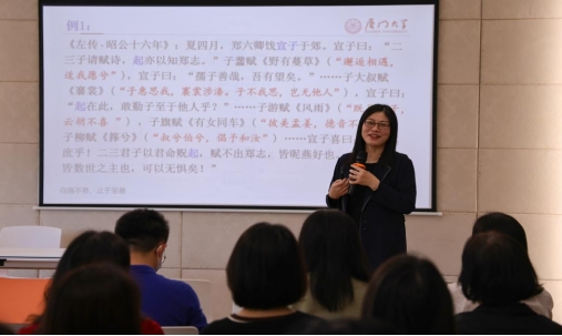 李菁以“品读《诗经》的两个维度——从《关雎》说起”为主题,从“温故而知新——《诗经》是什么?”“打开《诗经》的正确方式——以《关雎》为例”以及“无法抗拒的《诗经》文学之美”三个方面出发,带领在场教职工共同品读《诗经》,在感受文学之美的同时,探求《诗经》曾经具有过的政教功能和道德意义,获知古人对于社会、家庭、人生、伦理的观念态度乃至对于后世文化的巨大影响。