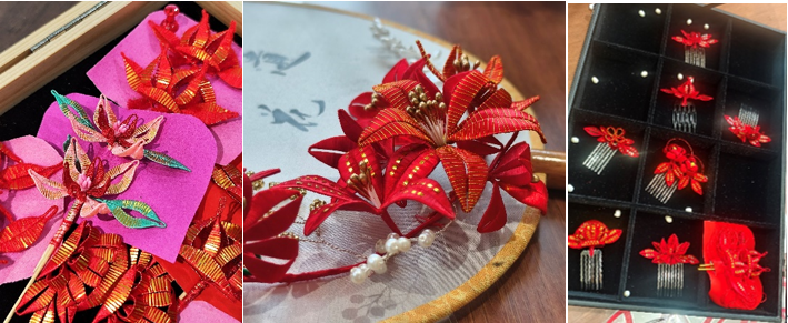 洪晓瑜为大家示范了春仔花的制作技艺,同学们在两位老师的指导下,学习缠、绕、捏等扎花的手工技巧。春仔花的制作看似简单,实则讲究技巧与耐心,每一道工序都透露着匠人的智慧和对美好生活的追求。同学们聚精会神,一丝一线,逐渐将一条条彩色丝线变成了立体的寓意吉祥的花朵,体验到了中国传统手工艺的乐趣与制作成功的惊喜,同时也深深感受到非遗传承人的不易。