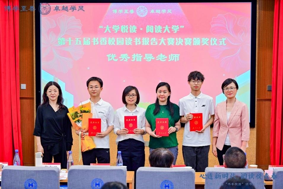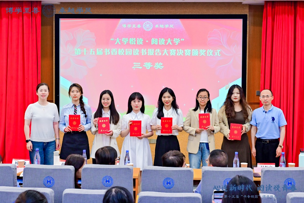 为深入实施“典耀中华”主题读书行动,推进书香校园建设工作,丰富校园文化生活,4月22日晚,厦门大学第十五届“书香校园”读书报告大赛决赛在思明校区化学报告厅落幕。全校共有来自各个学院的12支队伍进入决赛,经过激烈角逐,国际中文教育学院研究生第一党支部团队作品(成员:王晨光、颜诗晓、黄金玲、黄梦迪、柴莹莹)获三等奖,辅导员姜立恒获评“优秀指导教师”,学院荣获优秀组织奖。