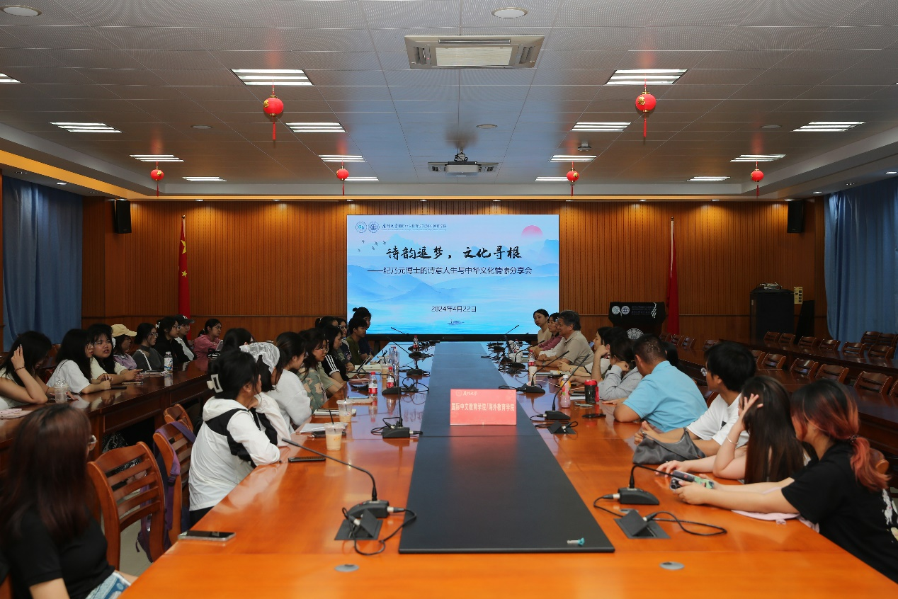 4月22日下午,国际中文教育学院在翔安校区坤銮楼C104举办“诗韵追梦,文化寻根——纪乃元博士的诗意人生与中华文化情愫分享会”。活动特邀大城钢结构有限公司(MCS STEEL PUBLIC CO.,LTD)董事长纪乃元博士与泰国皇太后大学汉学院经贸汉语班的同学座谈交流,活动由学院招生科负责人黄建军主持,华文系副主任郭建花、泰国班班主任蔡晴云及部分本科生一同参加。