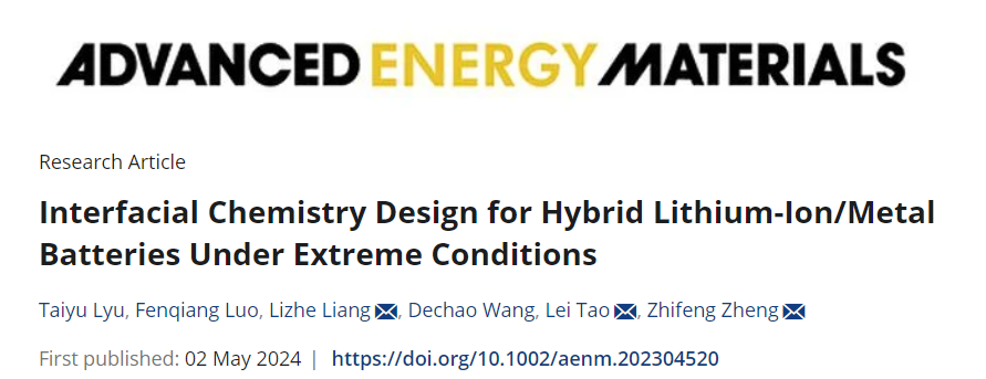 该工作以“Interfacial Chemistry Design for Hybrid Lithium-ion/Metal Batteries under Extreme Conditions”为题发表在国际知名期刊“Advanced Energy Materials”上。学院2021级博士生吕泰裕、2020级博士生罗奋强为该论文共同第一作者,郑志锋教授、弗吉尼亚理工大学陶磊博士、广西大学梁立喆老师为论文的共同通讯作者。论文还得到王德超老师的支持和帮助。该论文得到国家自然科学基金项目(No.31870570)和福建省科技计划项目(No.2020H4026, No.2022H6002)的支持。