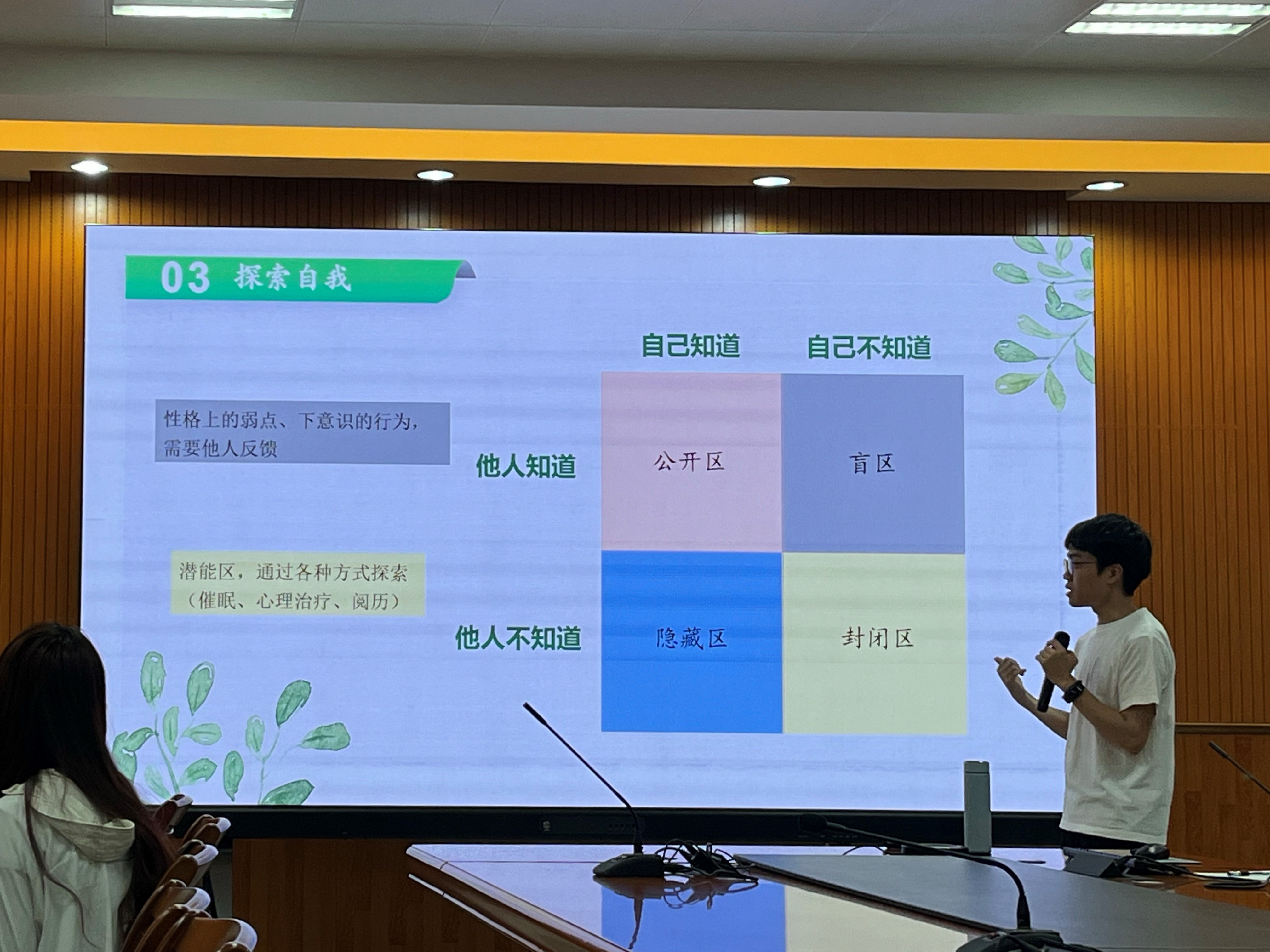 在探索自我环节,陈老师以“对我的认识是如何从无到有?”的心理学实验引入,通过画手掌、抽卡牌、写优点等游戏引领同学们逐层探索自我意识的表现形态、自我区域的划分等问题。同学们逐渐了解到对自我的认识和探索是持续一生的课题。